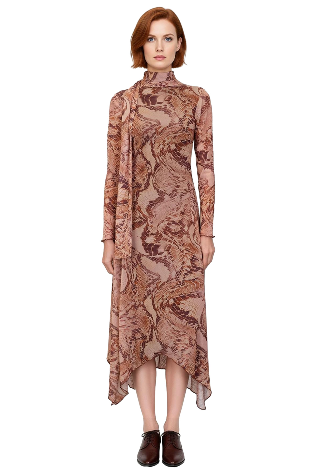 Uzun ve standart kol yapısıyla tasarlanan bu maxi boy elbise, kış sezonu için ideal bir seçenektir. Astarlı yapısı sayesinde şeffaflık endişesi olmadan güvenle giyilebilir. Asimetrik silueti, geleneksel kalıpların dışına çıkarak dinamik ve modern bir görünüm sunar. Tül örme kumaşın hafif dokusu, hem zarif bir düşüş sağlar hem de nefes alabilirlik özelliğiyle uzun süreli kullanımlarda bile rahatlık sunar. Ürünün dayanıklı yapısı ve kolay bakımı, onu gardırobunuzun vazgeçilmez bir parçası haline getirir.