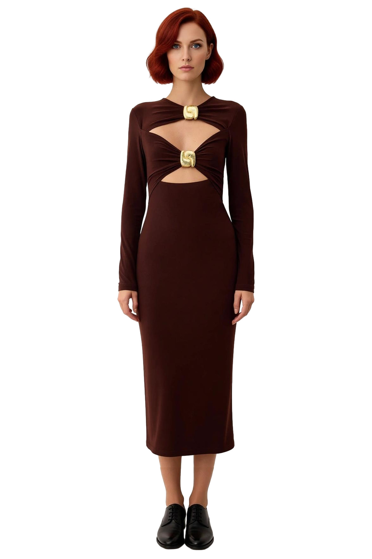 Bu kahverengi kadın elbisesi, fashion forward ruhunu taşıyan ve cesur seçimler yapmayı seven kadınlar için özel olarak tasarlandı. Bodycone kalıbı ile vücuda mükemmel bir şekilde oturarak iddialı ve şık bir görünüm sunar. Sandy örme kumaşın esnek yapısı, polyester ve elastan materyal bileşimi ile birleşerek gün boyu hareket özgürlüğü ve konfor sağlar. Düz deseni, aksesuar detaylarının ön plana çıkmasına izin verirken, zengin kahverengi tonu derinlik ve asalet katıyor. Bu elbise, modern çizgileri ve özgün tasarımıyla dikkat çekmek isteyenler için ideal bir tercih.