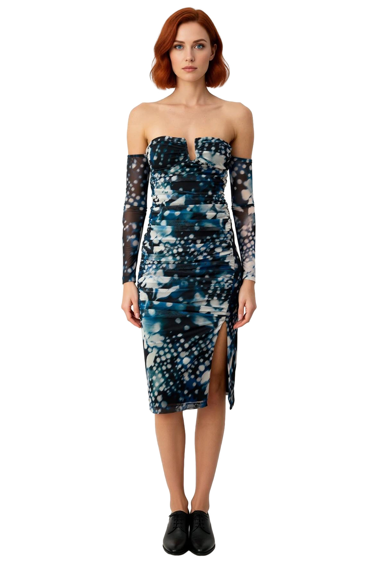 Ürün Özellikleri: Bodycon kalıp, %95 polyester %5 elastan materyal, soyut desen, carmen yaka, ayrı uzun kol, örme tül kumaş, çok renkli.