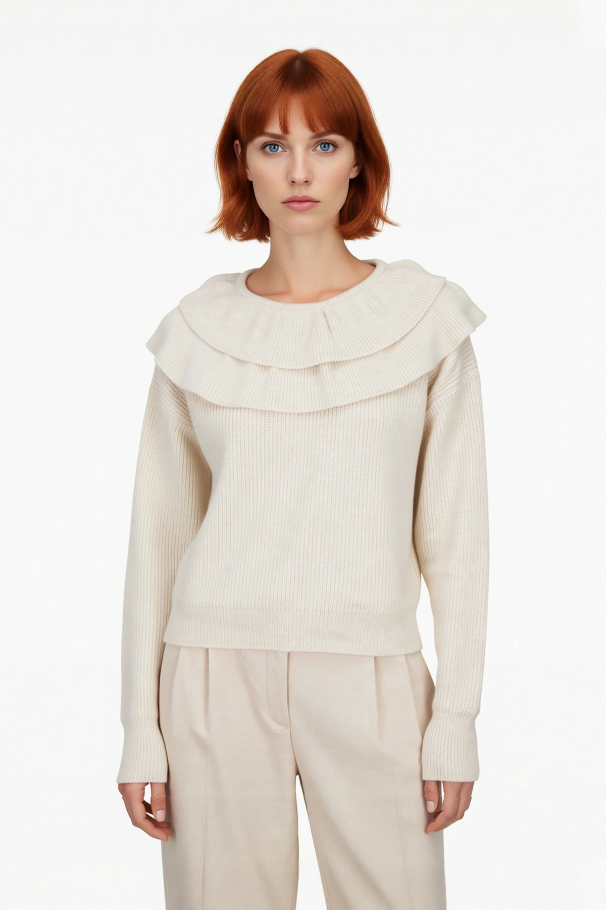Bisiklet yaka etrafındaki zarif katmanlı fırfır detayı, bu kazağa benzersiz bir karakter ve feminen bir hava katarken, boyun bölgesini şık bir şekilde vurgular. Uzun ve standart kol yapısı, soğuk havalarda tam koruma sağlarken, triko kumaşının nefes alabilen yapısı sayesinde gün boyu ferah ve rahat hissedersiniz. Orta kalınlıktaki dokusu, hem iç mekanlarda hem de dışarıda ideal bir sıcaklık sunarak kış ve mevsim geçişleri için uygundur. Tek plaka dokuma kalitesi ve materyal bileşiminin sağladığı yüksek dayanıklılık sayesinde, bu kazak uzun yıllar boyunca ilk günkü formunu ve yumuşaklığını korur. Makinede yıkanabilir olmasıyla da pratik bir kullanım deneyimi sunar.