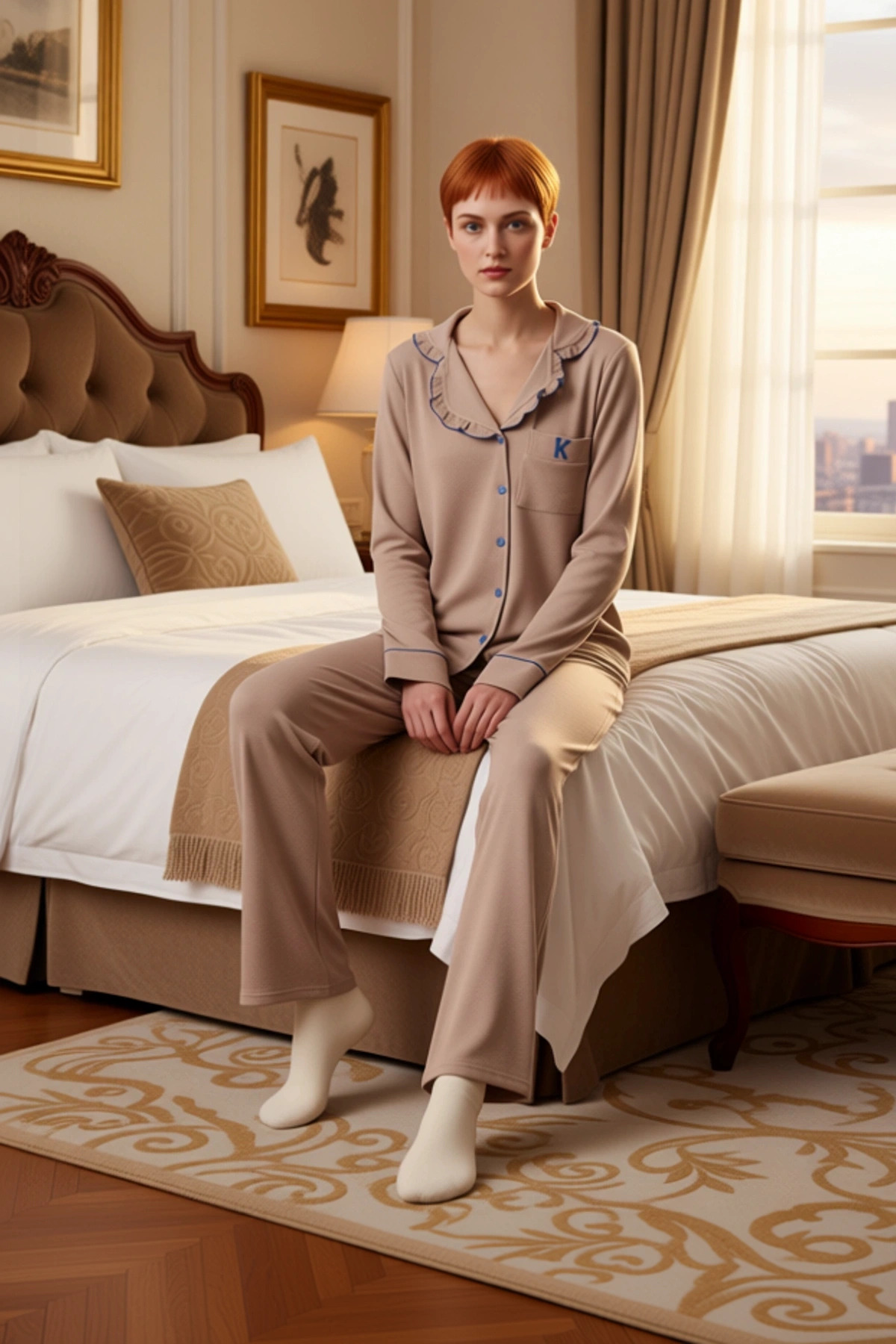Bu kadın pijama seti, %70 viskoz, %25 polyester ve %5 elastan içeren örme kumaşıyla maksimum konfor sunar. Bej rengi ve düz deseni, her yaşa ve tarza uygun bir seçenek oluşturur. Üzerindeki zarif sarma nakış ve fırfırlı yaka detayı, sete sofistike bir hava katarken, regular kalıbı rahat bir kullanım sağlar. Uzun kollu gömlek ve boru paça pantolon, hem şık hem de kullanışlı bir ikili oluşturur. Bu set, evde geçirilen zamanları daha keyifli hale getirmek için tasarlanmıştır. Homewear koleksiyonunun bir parçası olan bu ürün, cool ve konforlu bir yaşam tarzını benimseyen kadınlar için idealdir. Gömlek ve pantolonun uyumu, ev giyiminde de stil sahibi olmanızı sağlar. Örme kumaşın yumuşaklığı, cildinize nazikçe dokunarak gün boyu rahatlık hissi verir. Bu iki parçalı set, evinizde geçirdiğiniz her anı daha özel kılacaktır. Takımın gömlek yaka tasarımı, klasik bir dokunuş eklerken, fırfırlı detaylar ve zarif nakışlar ürüne feminen bir zarafet katar. Standart kesim uzun kollu üst ve boru paça alt, hareket özgürlüğünü kısıtlamadan rahat bir uyum sunar. Normal bel pantolon, gün boyu süren konforu garanti eder. Kaşkorse dokuma, kumaşa esneklik ve yumuşaklık kazandırarak, lounge ve ev ortamları için mükemmel bir seçim olmasını sağlar. Bu pijama seti, hem dinlenirken hem de ev işleriyle uğraşırken şık ve rahat hissetmek isteyen kadınlar için tasarlanmıştır. Ürün, cool ve konforlu bir persona yansıtmak isteyenler için özel olarak üretilmiştir. Kış aylarında sıcaklık ve konfor arayanlar için bu bej pijama seti biçilmiş kaftan. Bu şık takımı, yumuşak ev terlikleri, pelüş çoraplar veya rahat bir sabahlıkla tamamlayarak evdeki stilinizi zirveye taşıyabilirsiniz. Sabah kahvenizi yudumlarken veya akşamları dinlenirken bu seti tercih edebilirsiniz. Ürünün bakımı oldukça pratiktir; nazik yıkama talimatlarına uyulduğu sürece kumaşın kalitesi ve rengi uzun süre korunacaktır. Bu zarif ve kullanışlı pijama seti ile evinizdeki konforu yeniden tanımlayın.