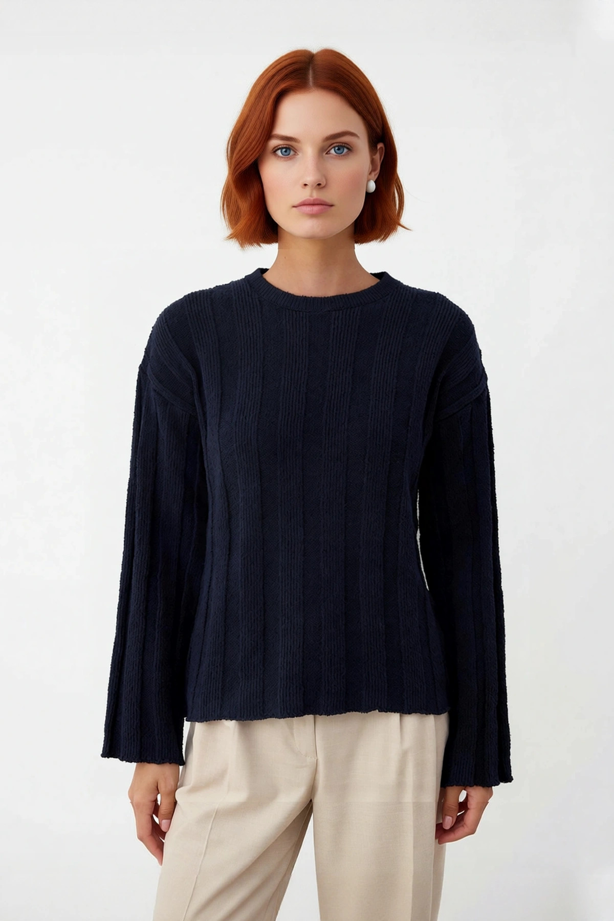 Ürün Özellikleri: Regular kalıp, 53% Polyester 47% Pamuk materyal, fitilli desen, bisiklet yaka, düşük kol, triko kumaş, lacivert renk.