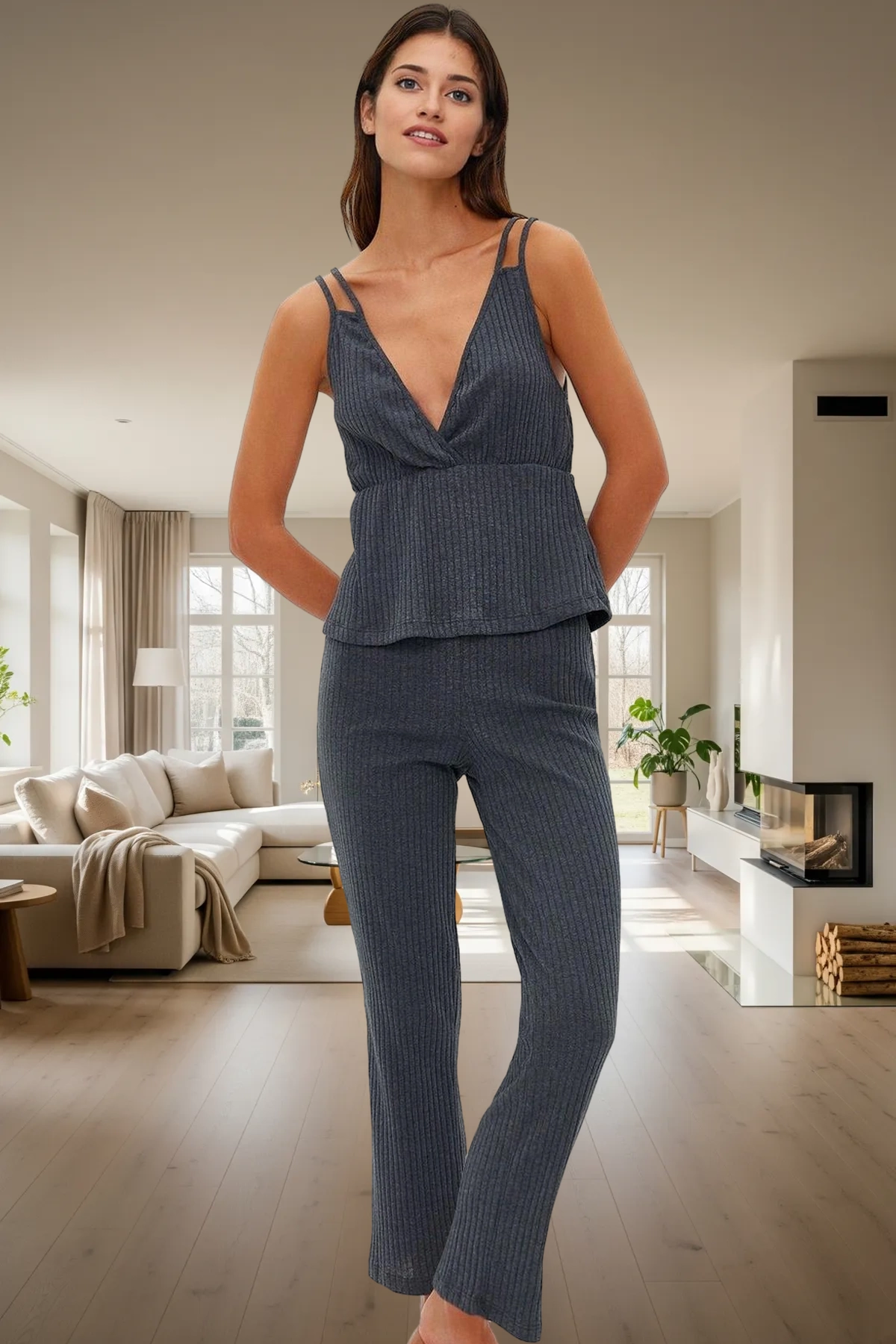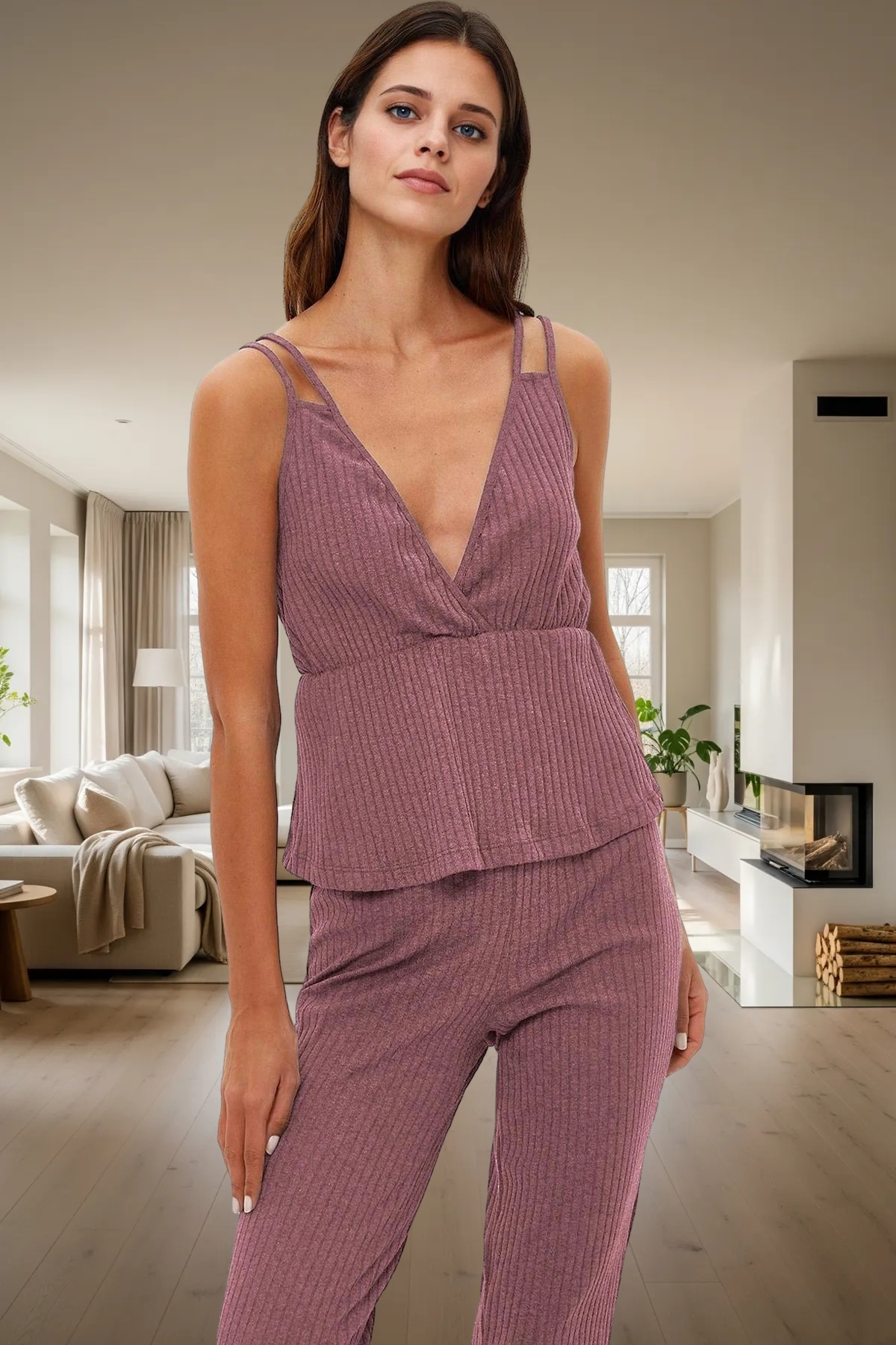 Kadın Fitilli İnce Askılı V Yaka Pijama Takımı Fonksiyonel Dayanıklı Kaliteli Konforlu Şık