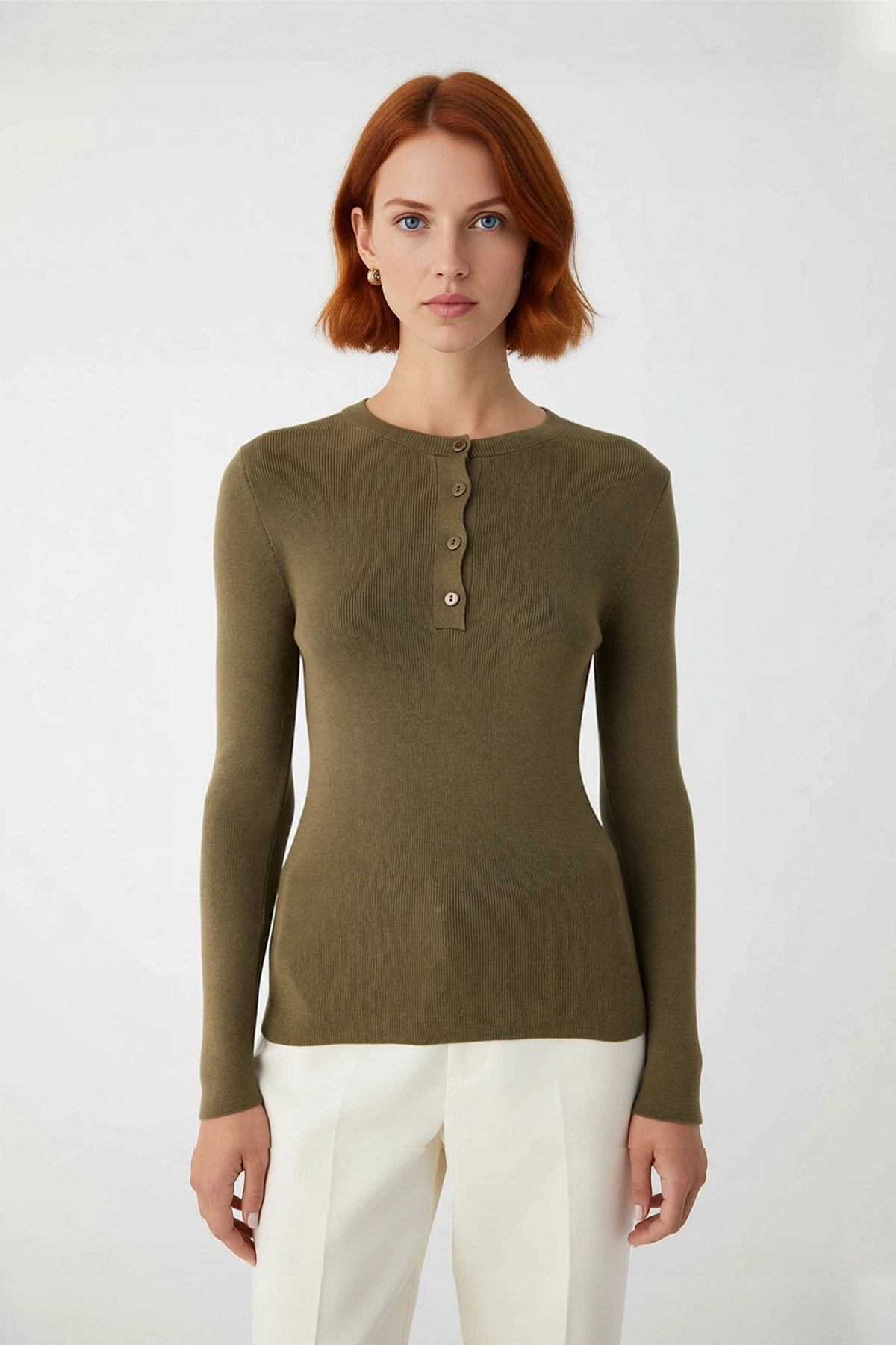 Bu kadın fitted basic merserize görünümlü düğmeli fitilli triko üst, sade şıklığı ve üstün konforu bir arada sunar. Vücuda oturan fitted kalıbı, modern ve zarif bir duruş sergilerken, %52 viskoz ve %48 akrilik materyal bileşimi sayesinde cildinize nazik bir dokunuş sağlar. Haki rengi, zamansız ve asil bir seçim olarak gardırobunuzda yerini alırken, düz deseni minimalist tarzı benimseyenler için idealdir. Fitilli dokuma detayı, ürüne karakteristik bir estetik katarken, basic tasarımı her kombine kolayca adapte olur.