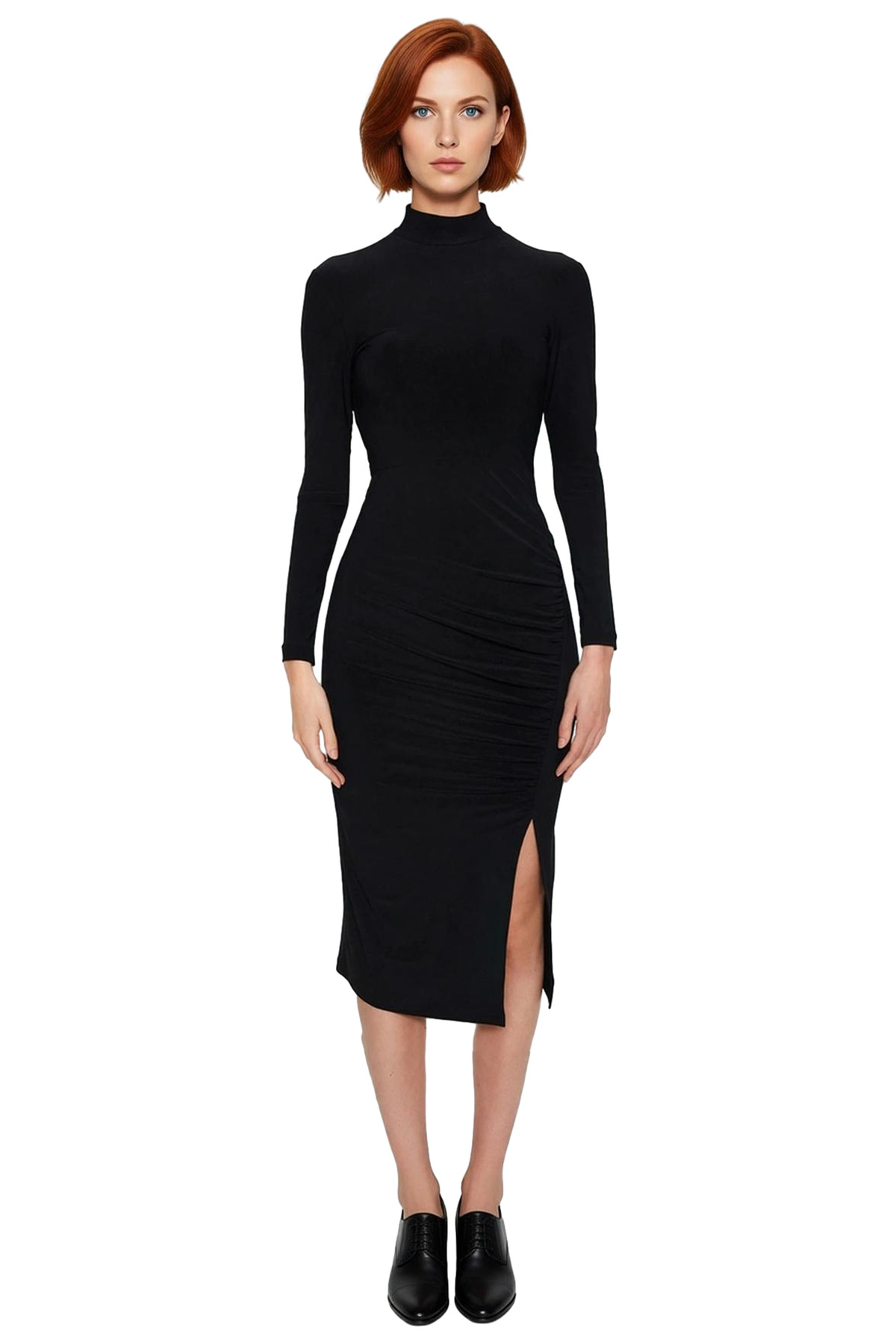 Ürün Özellikleri: Fitted kalıp, polyester karışımlı materyal, düz desen, dik yaka, uzun standart kol, örme kalın sandy kumaş, siyah renk, büzgü drape yırtmaç detay.