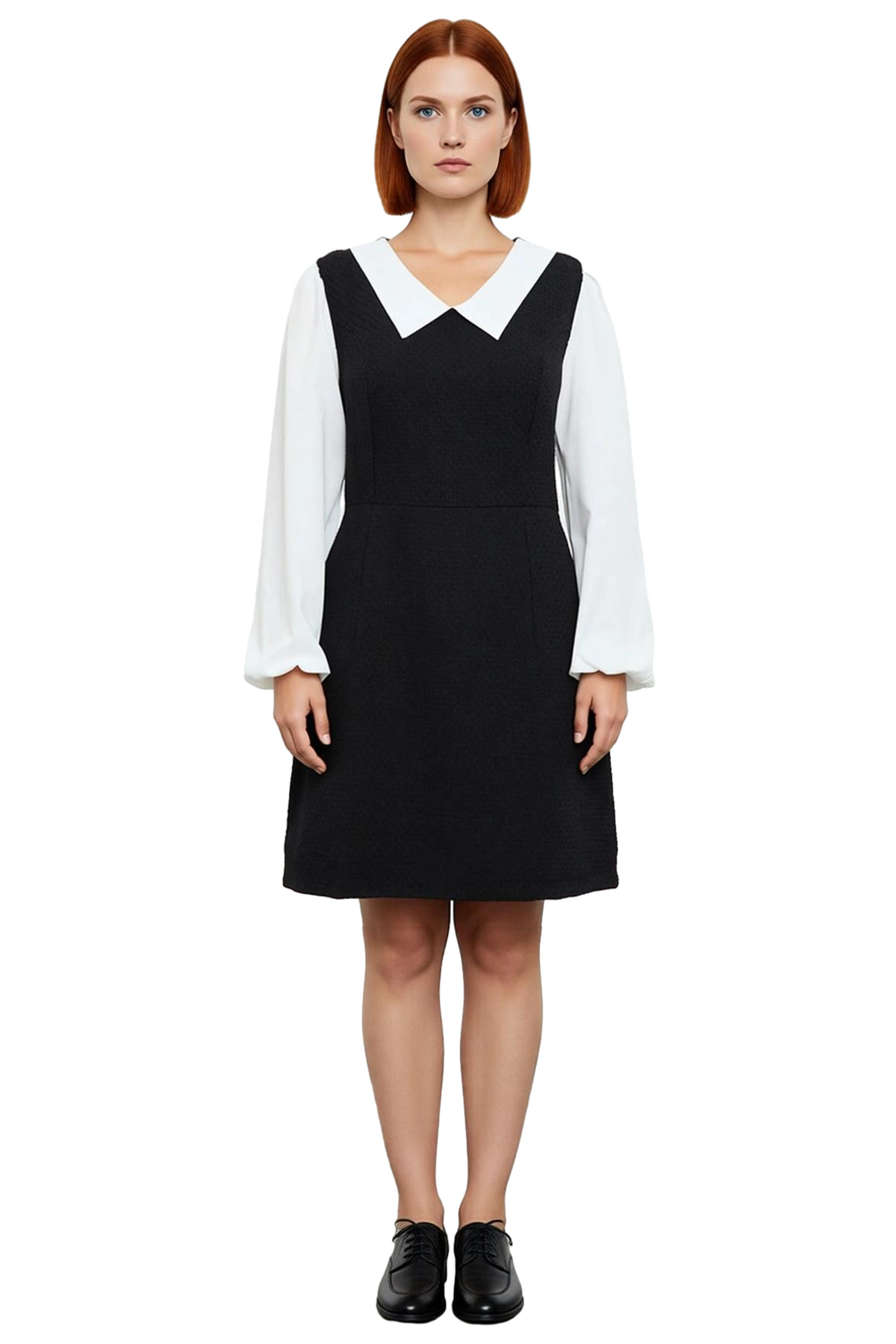 Bu kadın A-line elbise, gardırobunuzun vazgeçilmez parçası olmaya aday, modern ve şık bir tasarıma sahiptir. Tüvit dokuma kumaşı, hem göz alıcı bir estetik sunar hem de %49 pamuk, %28 polyester, %18 viskoz, %5 akrilik materyal bileşimi ile üstün konfor ve yumuşaklık sağlar. Elbisenin renk bloklu deseni, siyah ana gövdeyi beyaz gömlek yaka ve uzun kollarla harmanlayarak dinamik ve zarif bir kontrast oluşturur. Astarsız yapısı hafiflik sunarken, dokuma tüvit kumaşın kalitesi sayesinde ilkbahar ve sonbahar mevsimlerinde rahatlıkla giyilebilir. Casual ve günlük kullanım için ideal olan bu model, şıklığınızdan ödün vermeden rahatlığı tercih edenler için tasarlandı.