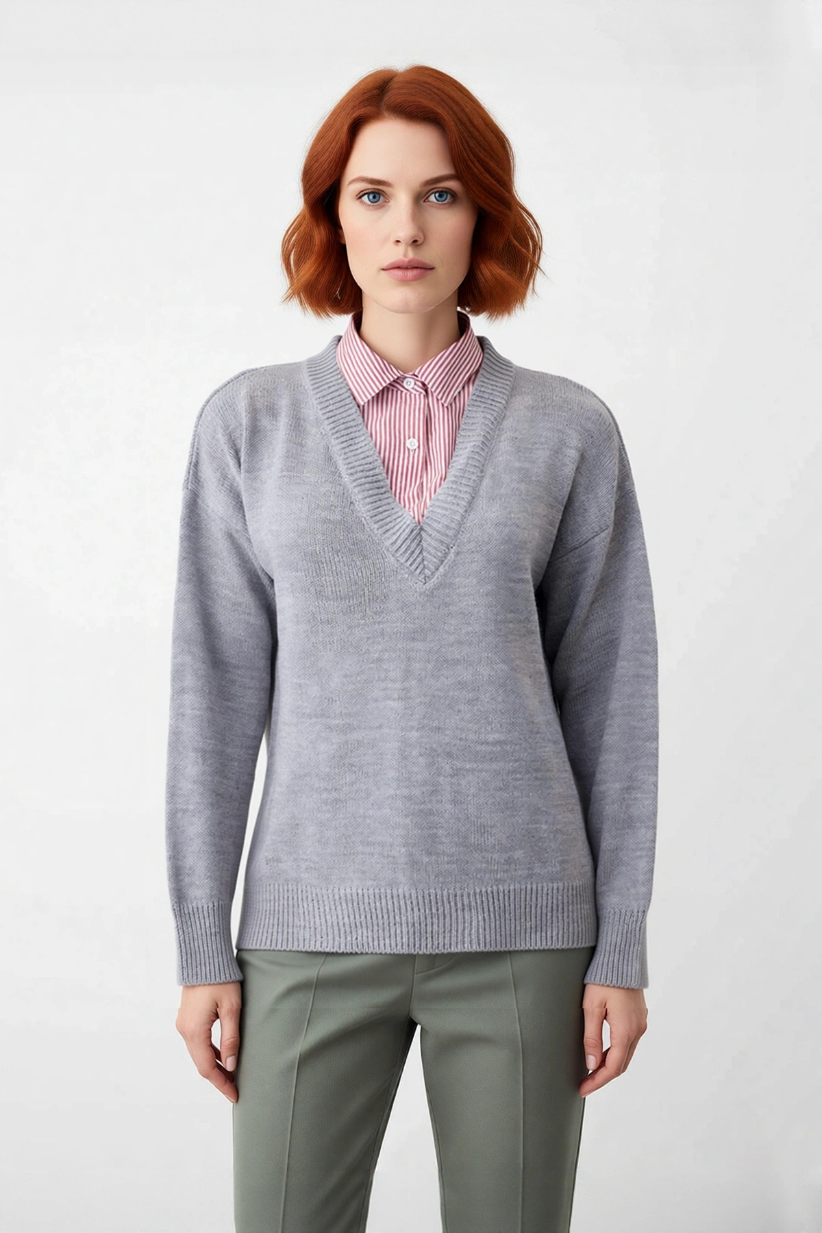 Ürün Özellikleri: Oversize kalıp, 100% akrilik materyal, renk bloklu desen, gömlek yaka, düşük uzun kol, triko kumaş, gri renk.