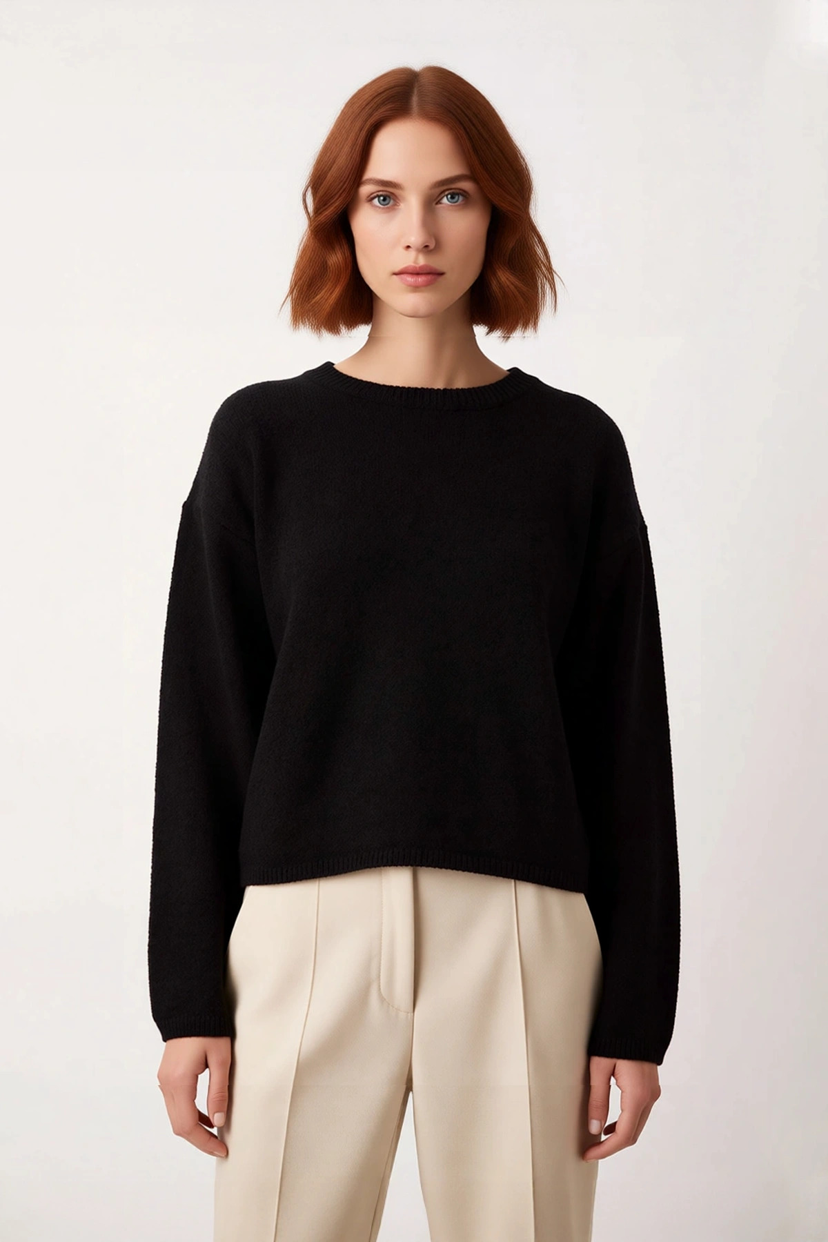 Ürün Özellikleri: Oversize kalıp, %50 polyester %50 pamuk materyal, düz desen, bisiklet yaka, düşük kol, triko kumaş, siyah renk.