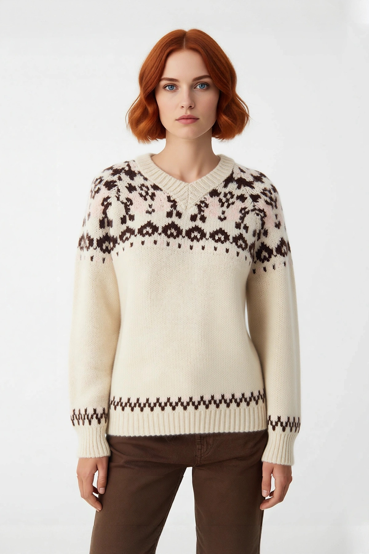Ürün Özellikleri: Oversize kalıp, akrilik polyester materyal, etnik desen, V yaka, reglan kol, triko kumaş, bej renk.