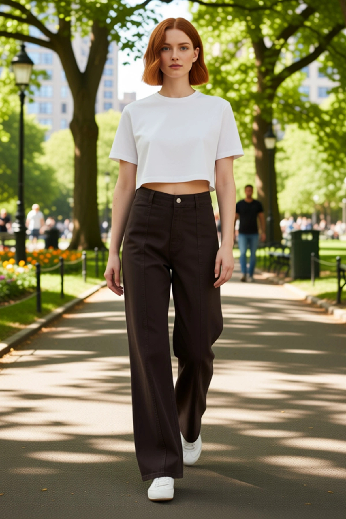 Kadınlar için tasarlanmış bu kahverengi wide leg jean pantolon, modern ve rahat bir stil arayanlar için ideal bir seçenektir. Yüksek bel özelliği, vücudu saran ve şekillendiren bir etki yaratırken, geniş paça kesimi hareket özgürlüğü sunar ve gün boyu konfor sağlar. Düz deseni ve zarif dikiş detayları, pantolona sofistike bir dokunuş katarken, %100 pamuk materyali sayesinde nefes alabilen ve yumuşak bir doku sunar. Rigid denim kumaşı, pantolonun formunu koruyarak uzun ömürlü bir kullanım vaat eder. Bu jean, casual ve günlük kullanım için mükemmel bir tercihtir. Kahverengi rengi, farklı renklerle kolayca uyum sağlayarak stilinize zenginlik katar. Cool ve comfort persona ile tasarlanan bu ürün, hem şıklığı hem de rahatlığı ön planda tutar. Bu pantolon, gardırobunuzda zamansız bir parça olarak yerini alacaktır. Bu geniş paça jean pantolonun en belirgin özelliklerinden biri, ön ve arka kısımlardaki dikiş detaylarıdır. Bu dikişler, pantolona özgün bir karakter kazandırır. Yüksek bel kesimi, bel bölgesini vurgulayarak daha ince bir görünüm elde etmenize yardımcı olur. Wide leg silueti, bacakları tamamen kapatmadan zarif bir şekilde aşağı doğru iner. %100 pamuk içeriği, cildinize nazik davranır ve alerjik reaksiyon riskini en aza indirir. Rigid denim, zamanla vücudunuza uyum sağlayarak kişiselleşmiş bir his verir. Bu pantolon, hem rahatlığı hem de estetik görünümü bir arada sunarak kadınların günlük yaşamlarında tercih edebilecekleri çok yönlü bir giysidir. Dikişlerin belirginliği, pantolonun genel tasarımına modern bir yorum katar. Bu kahverengi wide leg jean pantolon, her mevsim rahatlıkla giyilebilir. İlkbahar ve yaz aylarında hafif bir tişört veya crop top ile, sonbahar ve kış aylarında ise kazak veya sweatshirt ile kombinleyebilirsiniz. Kombin önerisi olarak, bu pantolonu beyaz bir gömlek ve loafer ayakkabılarla tamamlayarak şık bir ofis stili yaratabilirsiniz. Daha spor bir görünüm için, grafik baskılı bir tişört ve sneakerlarla kullanabilirsiniz. Pantolonun bakımı için, düşük sıcaklıkta ve benzer renklerle birlikte yıkamanız önerilir. Bu jean, hem zamansız tasarımı hem de pratik kullanımı ile öne çıkar.