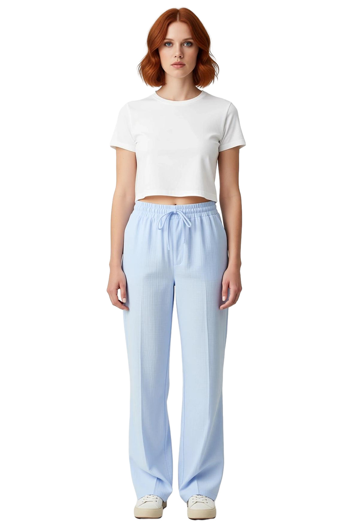 Bu kadın pantolonu, rahatlığı ve şıklığı bir arada sunan müslin kumaşıyla dikkat çekiyor. Geniş paça kesimi, modern ve ferah bir görünüm sağlarken, yüksek bel detayı silüeti daha uzun gösterir. %50 pamuk ve %50 polyester karışımı olan kumaş, hem yumuşak dokusu hem de dayanıklılığı ile öne çıkar. Düz mavi rengi, her türlü üst giyimle kolayca uyum sağlayarak gardırobunuzun joker parçası olmaya adaydır. Müslin dokusunun hafifliği, özellikle sıcak havalarda maksimum konfor sunar. Casual ve günlük kullanım için tasarlanmış bu pantolon, cool ve konforlu bir stil yaratmak isteyen kadınlar için idealdir. Wide leg silüeti ve uzun boyu, zarif ve modern bir duruş sergiler. Pantolonun yüksek bel tasarımı, vücut hatlarını güzelce vurgulayarak daha fit bir görünüm kazandırır. Geniş paça kesimi, hareket özgürlüğü sunarken aynı zamanda şık bir dökümlülük sağlar. Bel kısmındaki lastik detayı, gün boyu rahat bir kullanım sunar ve pantolonun kolayca giyilip çıkarılmasını sağlar. Müslin kumaşın nefes alabilen yapısı, terlemeyi önleyerek özellikle yaz aylarında serin ve konforlu kalmanıza yardımcı olur. Bu pantolon, hem evde rahatça vakit geçirmek hem de dışarıda şık bir görünüm sergilemek isteyen kadınlar için çok yönlü bir seçenektir. Kaliteli materyal bileşeni, uzun süreli kullanım için dayanıklılık sunar. Yaz mevsiminin vazgeçilmezi olan bu pantolon, basic tişörtler, keten gömlekler ve şık bluzlarla mükemmel bir uyum yakalar. Beyaz bir atlet ve espadril ile kombinleyerek rahat bir hafta sonu stili oluşturabilirsiniz. Açık renk bir crop top ve platform sandaletlerle daha dikkat çekici bir görünüm elde edebilirsiniz. Bu pantolon, hem şık hem de rahat bir görünüm arayan her kadın için dolabında bulunması gereken bir parçadır. Makinede hassas programda yıkanması tavsiye edilir.