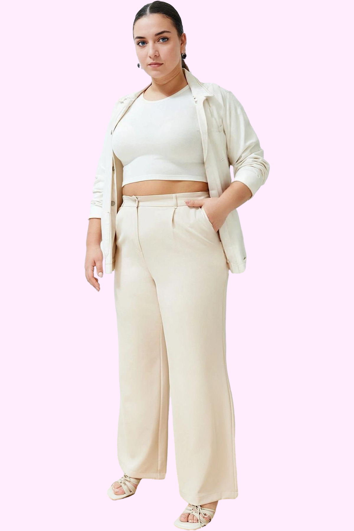 Şıklığı ve rahatlığı bir araya getiren bu bej renkli kadın pantolonu, iş ve günlük yaşamınızda tarzınızı yansıtmanıza yardımcı olacak. Yüksek bel tasarımı ve geniş paçası ile modern bir görünüm sunarken, dokuma kumaş yapısı ise gün boyu konfor sağlar. Ramazan koleksiyonundan özel seçilmiş olan bu pantolon, ince detaylarıyla göz kamaştırıyor.