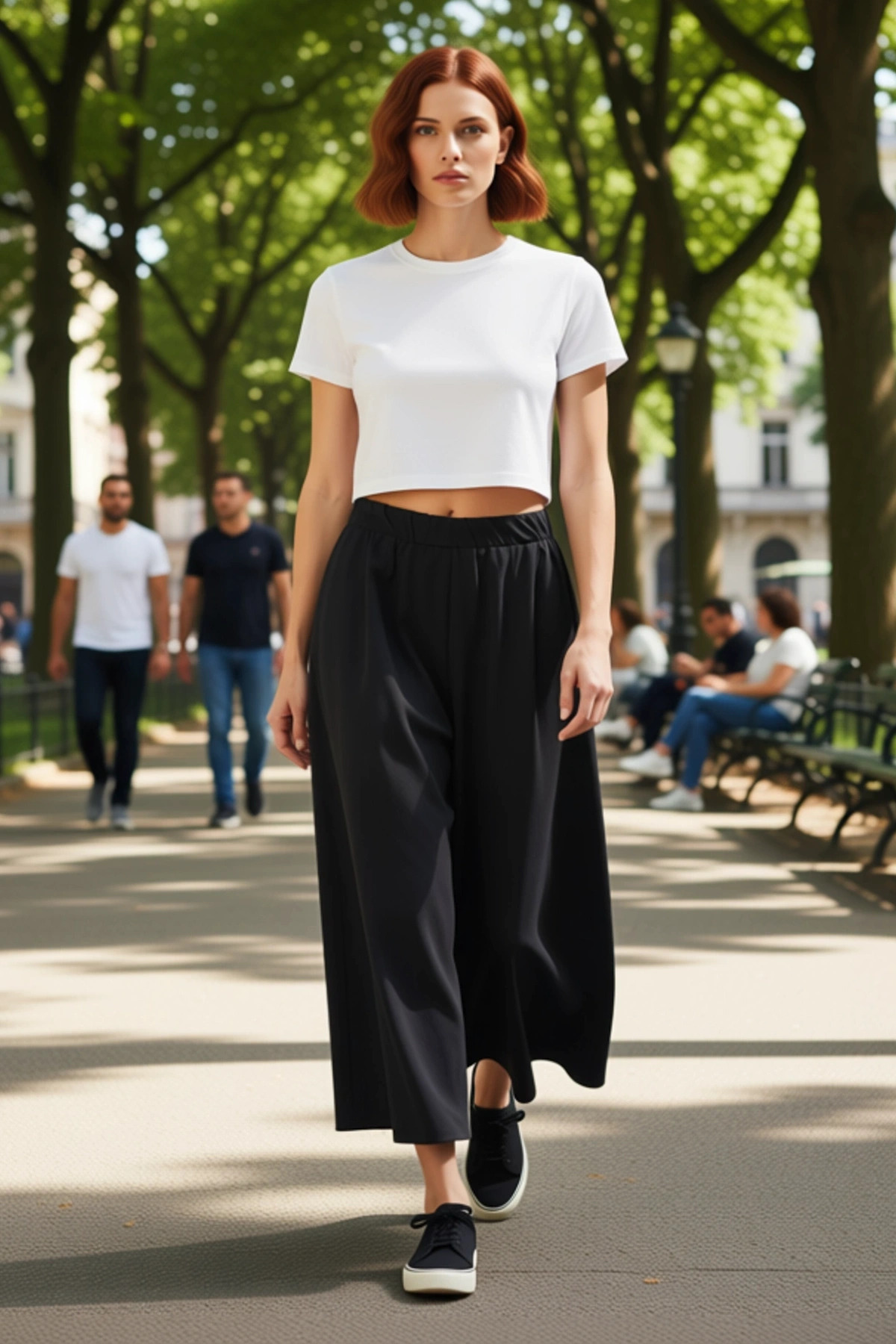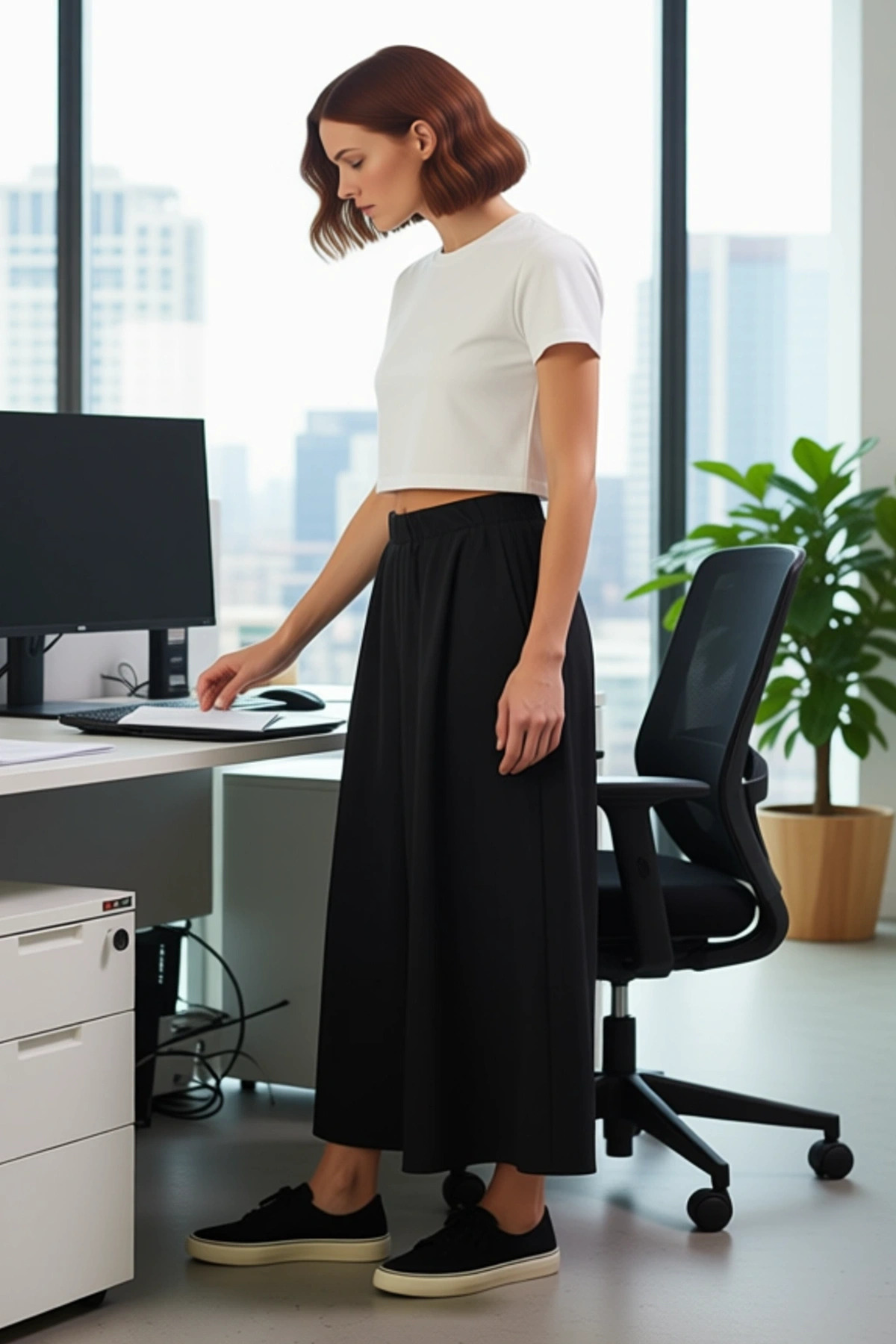 Kadınlar için tasarlanmış bu siyah, etek görünümlü wide leg pantolon, modern ve rahat bir stil sunuyor. Palazzo kalıbı ve ekstra geniş paçaları ile dikkat çeken bu parça, yüksek bel özelliğiyle vücut hatlarını zarifçe vurguluyor. %50 pamuk ve %50 polyesterden oluşan terrycotton kumaşı, hem yumuşaklığı hem de dayanıklılığı ile öne çıkıyor. Düz ve mat dokusu, pantolona sofistike bir hava katarken, günlük kullanım için de uygun bir seçenek haline getiriyor. Bu pantolon, cool ve comfort persona anlayışıyla üretilmiş olup, hareket özgürlüğü sunan geniş kesimi sayesinde gün boyu konforlu bir kullanım sağlıyor. Siyah rengi, her türlü üst ve ayakkabı ile kolayca kombinlenebilme avantajı sunuyor. Uzun boyu ve wide leg silueti, şık ve modern bir görünüm elde etmek isteyenler için ideal bir seçimdir. Bu pantolon, hem şıklığı hem de rahatlığı bir arada arayan kadınlar için vazgeçilmez bir parça olacaktır. Bu pantolonun tasarımında konfor ve stil ön planda tutulmuştur. Yüksek bel detayı, modern bir görünüm sunarken, beldeki lastik detayı ekstra bir rahatlık sağlıyor. Geniş paça kesimi, palazzo kalıbıyla birleşerek eteği andıran bir siluet oluşturuyor. Bu sayede hem pantolonun rahatlığını yaşayabilir hem de etek şıklığını yakalayabilirsiniz. Yaka veya kol detayı bulunmayan bu pantolon, üzerinize giyeceğiniz farklı üstlerle harika uyum sağlayacaktır. Terrycotton kumaşın yumuşak dokusu, cildinize nazik davranırken, %50 pamuk %50 polyester karışımı kumaşın nefes alabilirliği gün boyu ferahlık hissi veriyor. Bu pantolon, günlük şıklığınızı tamamlarken aynı zamanda rahat bir kullanım sunmak üzere tasarlanmıştır. İlkbahar ve sonbahar aylarında rahatlıkla kullanabileceğiniz bu pantolon, farklı stil önerileriyle zenginleştirilebilir. Üzerine basic bir tişört, şık bir gömlek veya salaş bir kazak giyerek farklı görünümler elde edebilirsiniz. Altına sivri burunlu babetler, şık topuklu ayakkabılar veya modern sneakerlar ile tamamlayarak stilinizi kişiselleştirebilirsiniz. Bu pantolon, hem şık hem de rahat bir görünüm arayan her kadın için harika bir seçenektir. Kumaşın ömrünü korumak için nazik yıkama talimatlarına uyulması tavsiye edilir.