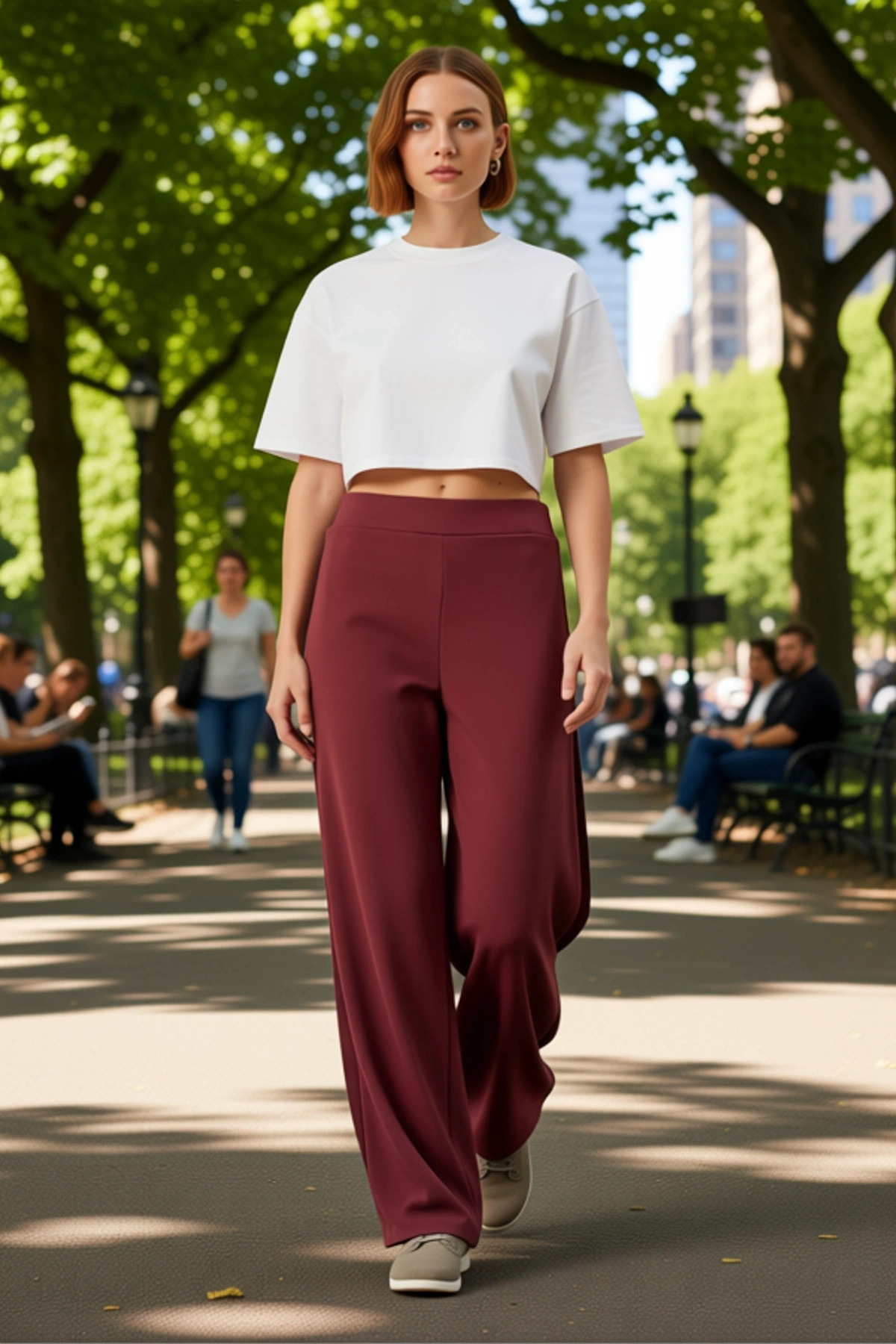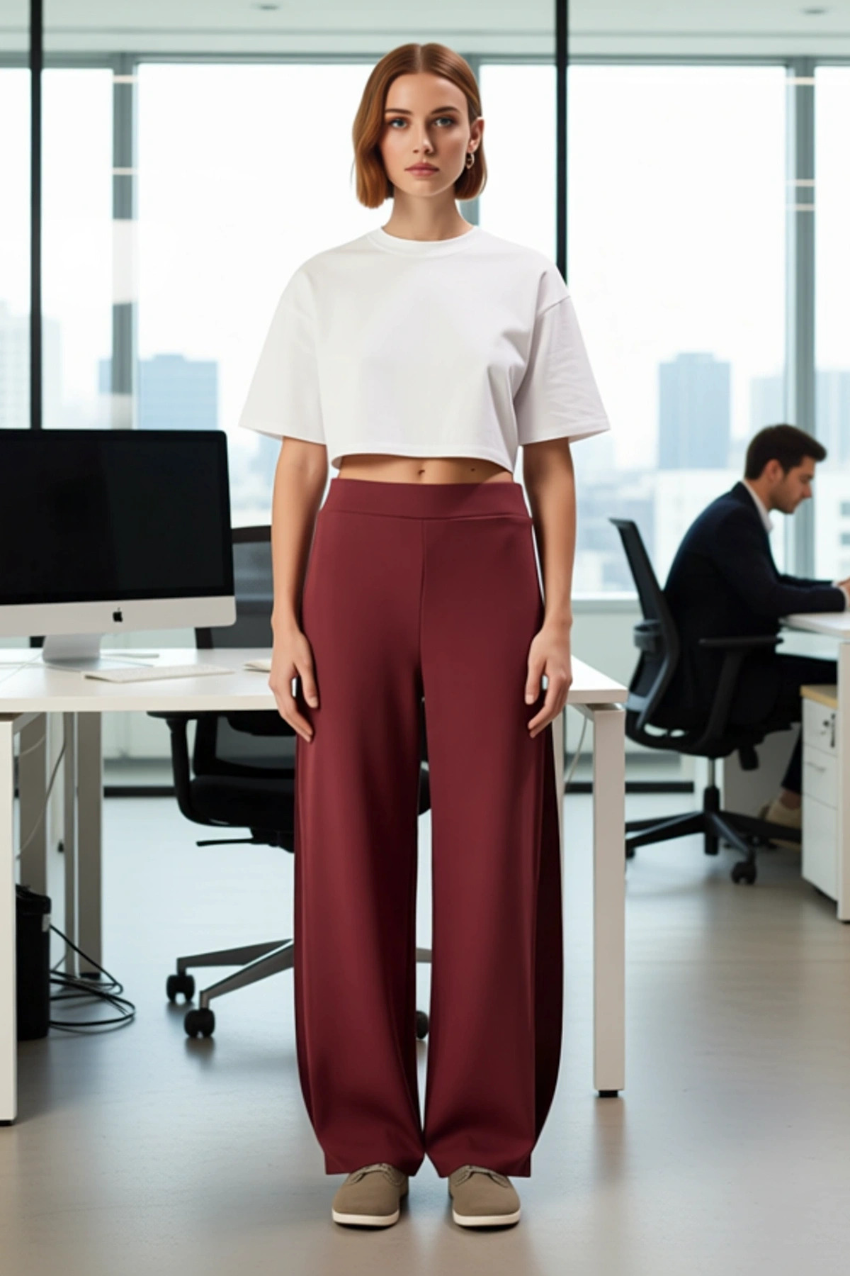 Şıklığı ve rahatlığı bir araya getiren bordo renkli geniş paça pantolonumuz, yaz aylarının vazgeçilmez parçası olacak! Yüksek bel tasarımı, vücut hatlarınızı mükemmel şekilde ortaya koyarken, geniş paçası ise özgürce hareket etmenizi sağlar. Nefes alan ve esnek yapısıyla gün boyu konfor sunan bu pantolon, 95% polyester ve 5% elastan karışımı kumaştan üretilmiştir. Regular boyu ile her vücut tipine uygun bir seçenektir.