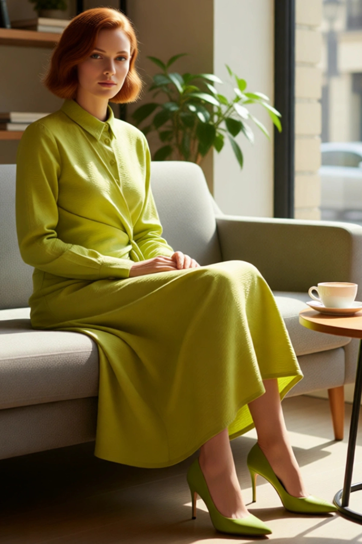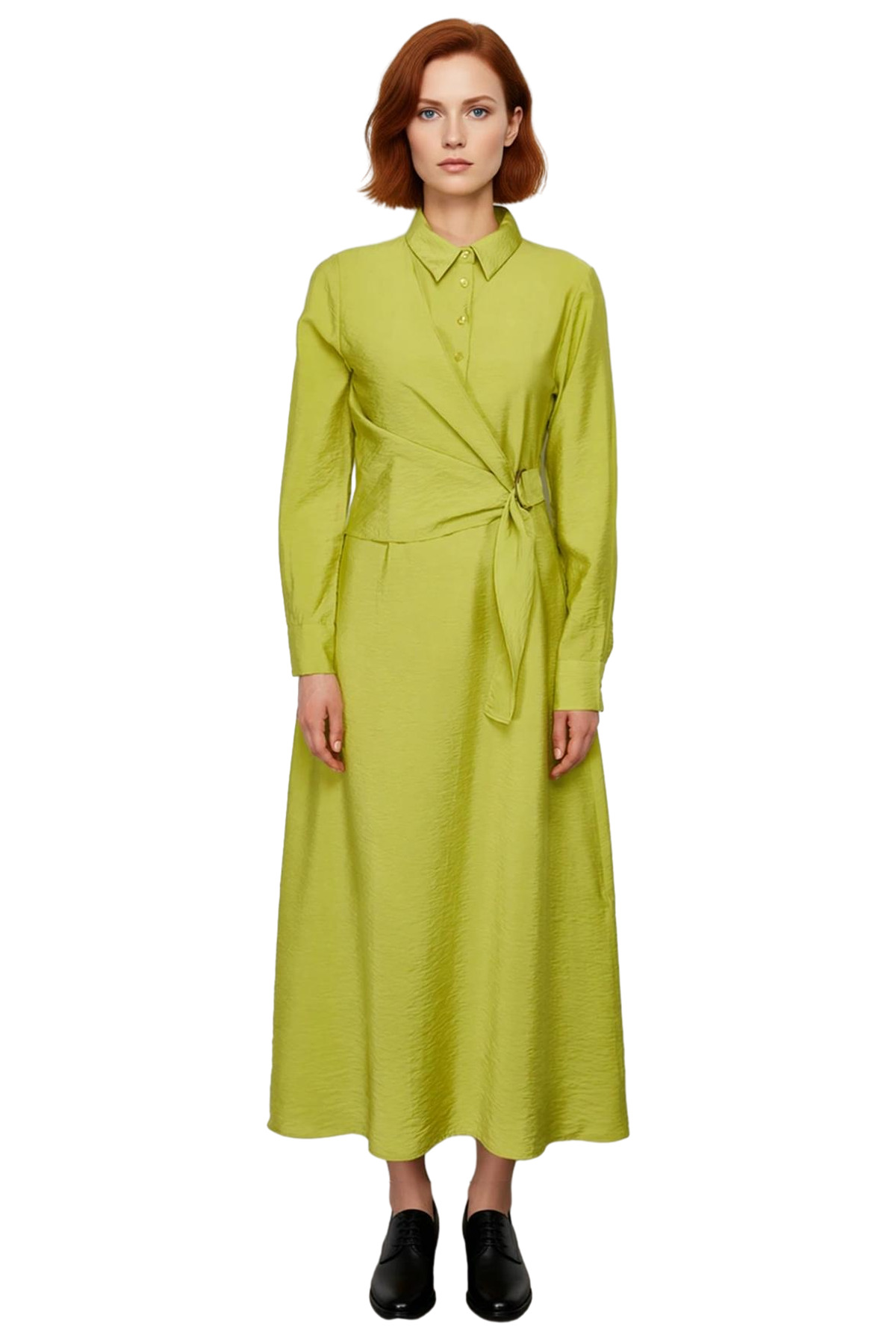 Ürün Özellikleri: A-line kalıp, viskoz poliamid materyal, düz desen, gömlek yaka, standart kol, dokuma kumaş, yeşil renk.