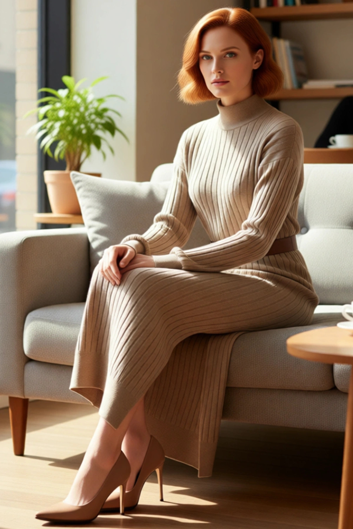 Ürün Özellikleri: Shift kalıp, 100% akrilik materyal, düz desen, dik yaka, düşük kol, triko kumaş, bej renk.