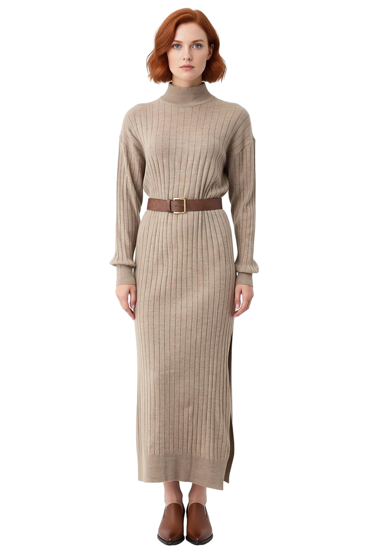 Bu Kadın Maxi Triko Elbise, %100 akrilik materyali sayesinde soğuk havalar için ideal, konforlu ve yumuşak bir giyim deneyimi sunar. İnce triko dokusuyla hafif bir yapıya sahip olmasına rağmen sıcak tutan bu elbise, günlük kullanımda rahatlığınızdan ödün vermeden şıklığı yakalamanızı sağlar. Düz bej rengi, her türlü aksesuarla ve dış giyimle kolayca uyum sağlar. Beldeki kemer detayı, zarif bir siluet oluştururken, etekteki yırtmaç detayı modern ve dinamik bir hava katarak hareket özgürlüğünü artırır.