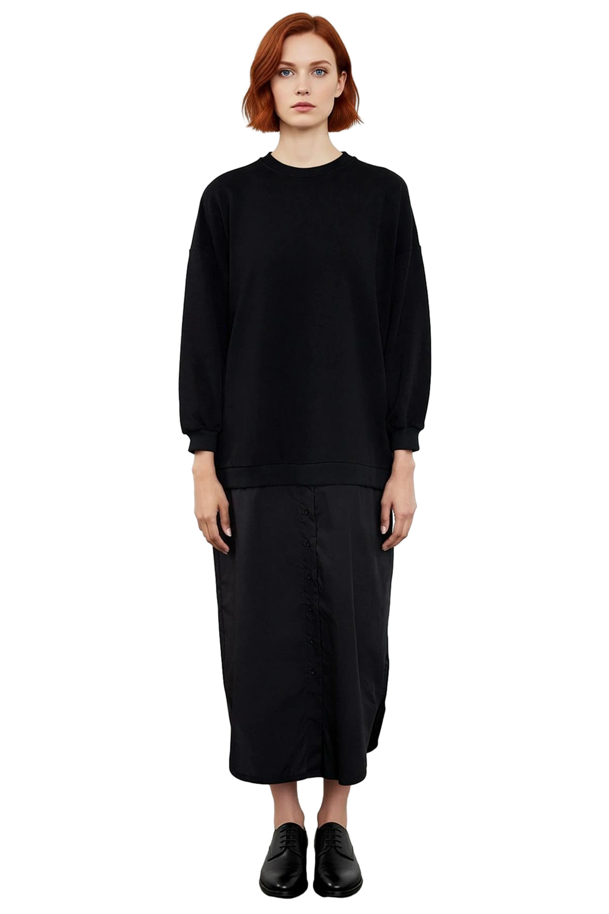 Elbisenin bisiklet yaka tasarımı, sade ve şık bir duruş sergilerken, düşük kol tipi ve uzun kol boyu özellikle kış aylarında sıcak tutma özelliğiyle öne çıkar. Üst kısmındaki 3 iplik penye örme kumaş, yumuşak dokusuyla konfor sağlarken, alt kısmındaki dokuma detayı tasarıma zenginlik katar. Astarsız yapısı sayesinde hafif ve katmanlı giyime uygun olup, cepsiz ve kemersiz tasarımıyla minimalist bir çizgiyi benimser. %65 pamuk ve %35 polyester karışımı sayesinde hem dayanıklı hem de cilt dostu olan bu elbise, T10 yıkama talimatlarına uygun olarak kolayca temizlenebilir, pratik bir kullanım sunar.