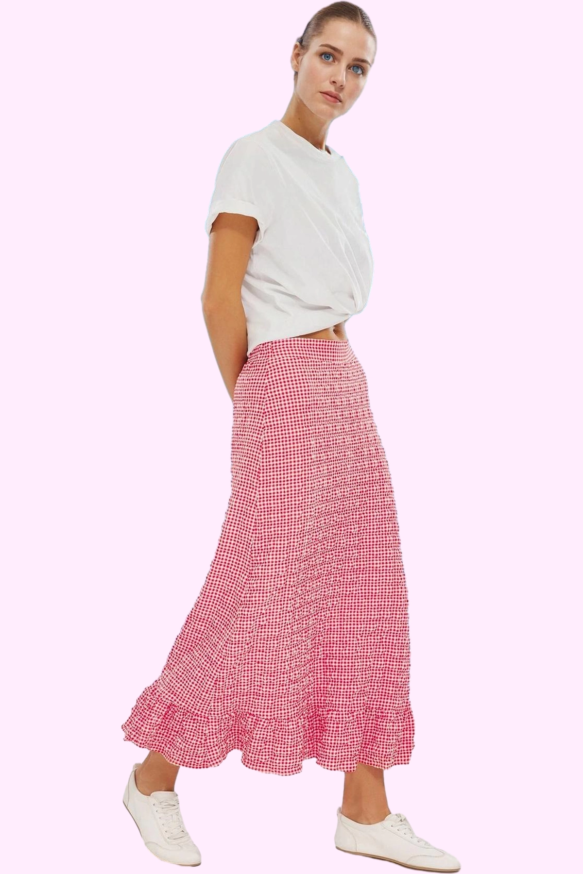 Bu etek, özel olarak seçilmiş yüksek kaliteli malzemelerden üretilmiştir. Gofre dokuma, eteğe hem modern bir görünüm kazandırır hem de nefes alabilir bir yapı sunar. Ekose desen ise kombinlerinize enerjik bir dokunuş katmanıza yardımcı olur. Yaz aylarında hem plajda şık bir görünüm oluşturmak hem de şehirde günlük kombinlerinizde kullanmak için mükemmel bir seçenektir. Bir tişört ve spor ayakkabı ile rahat bir stil yaratabilir veya daha şık bir görünüm için bluz ve topuklu ayakkabı ile kombinleyebilirsiniz.