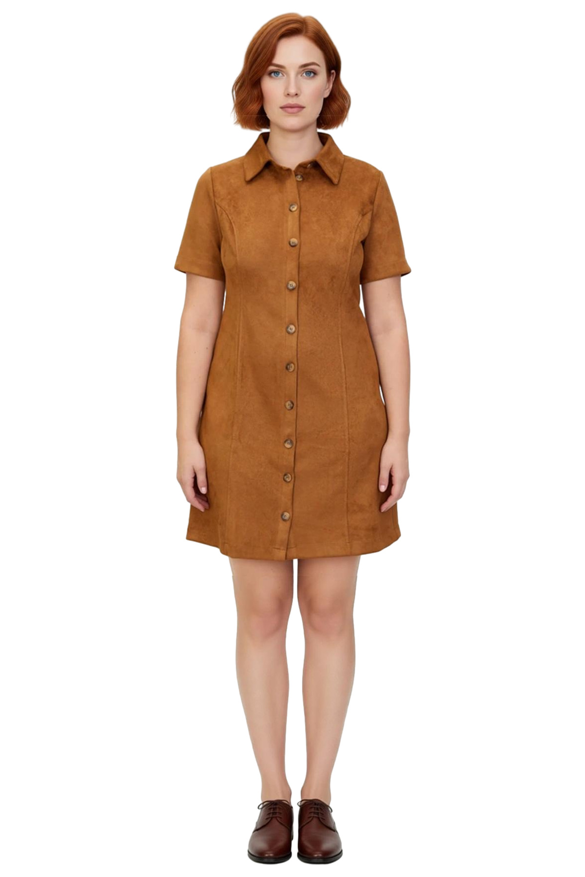 Ürün Özellikleri: A-line kalıp, %90 Polyester %10 Elastan materyal, düz desen, gömlek yaka, kısa kol, dokuma kumaş, kahverengi renk.