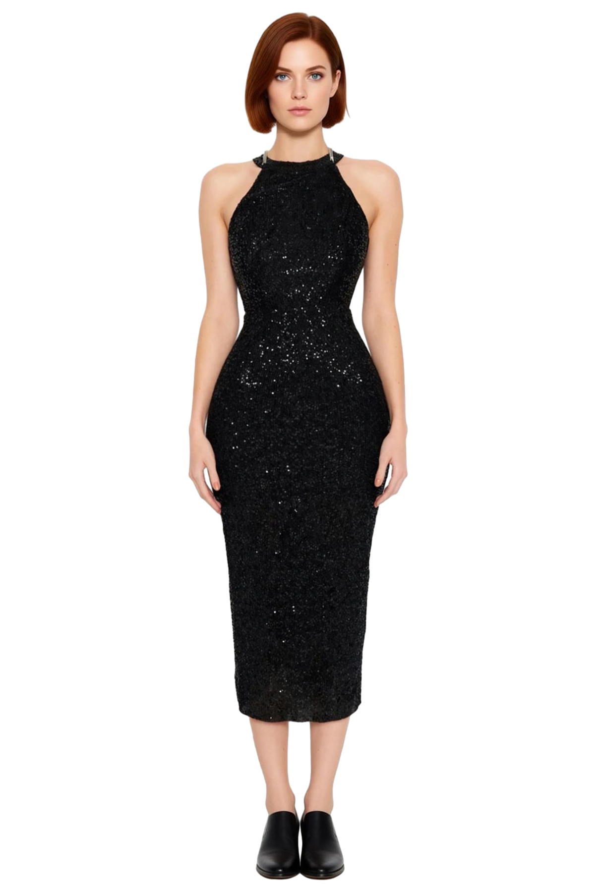 Ürün Özellikleri: Bodycon kalıp, polyester karışımlı materyal, düz desen, halter yaka, kolsuz kol, örme kumaş, siyah renk, parıltılı tasarım.