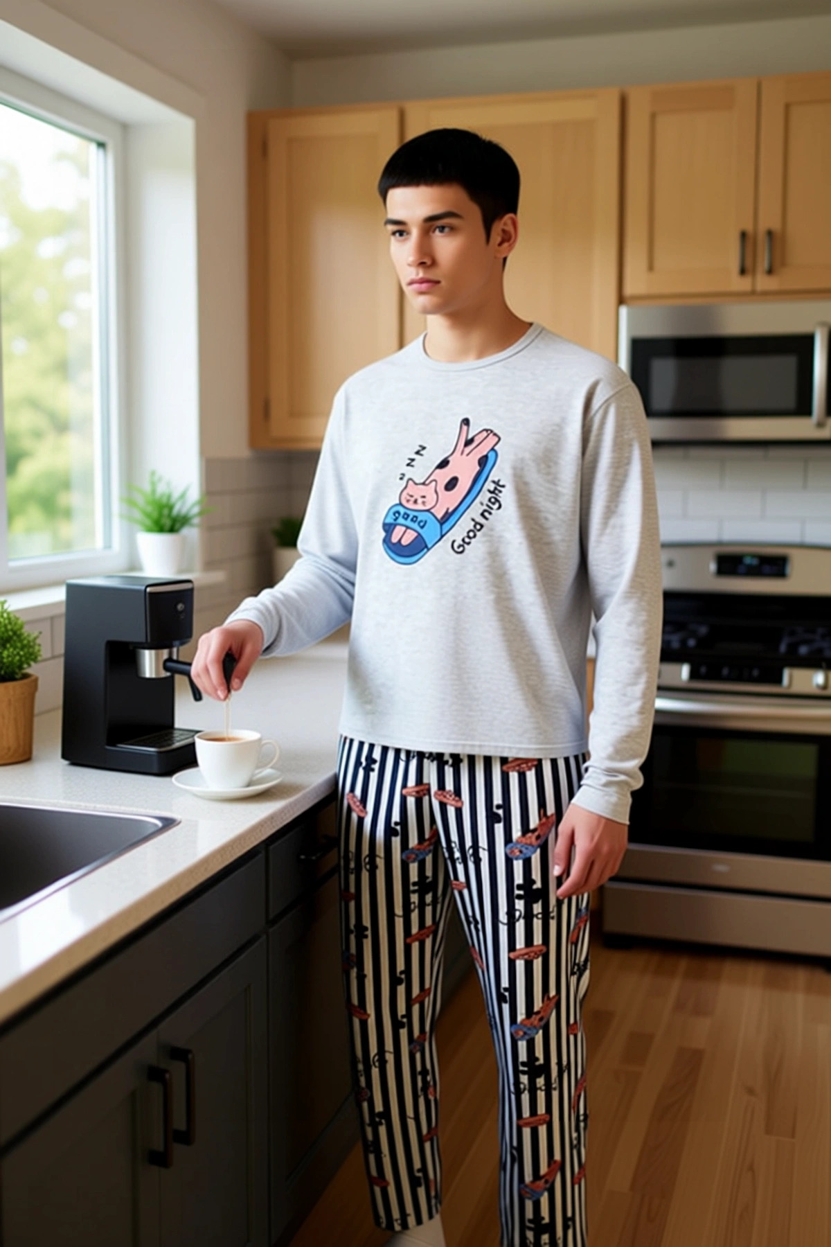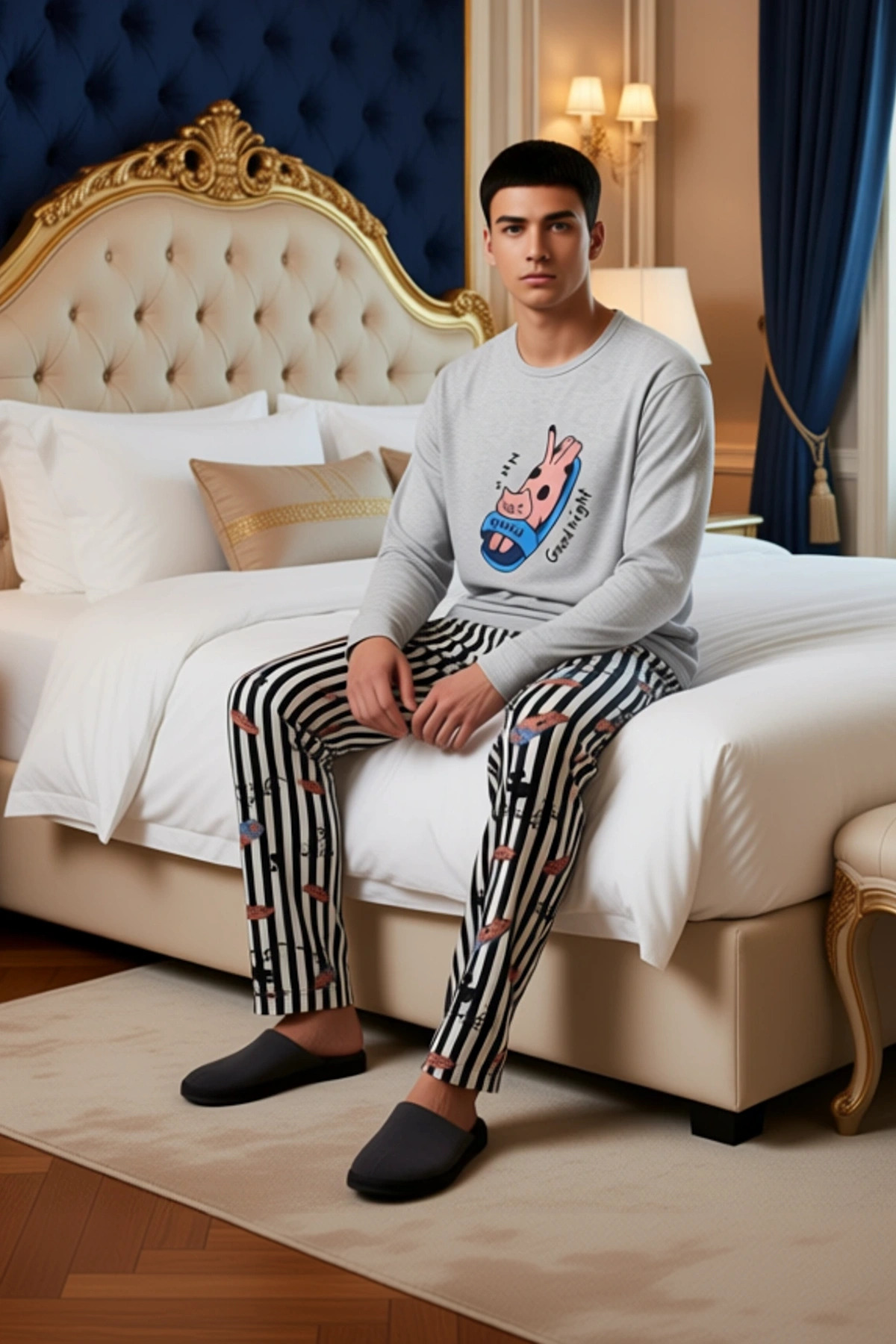 Bu kadın pijama takımı, eğlenceli hayvan baskısı ve modern çizgili deseniyle dikkat çekiyor. Üst kısım, rahat bir bisiklet yaka ve uzun kollu bir sweatshirt olarak tasarlanmıştır. Üzerindeki sevimli kedi baskısı, takıma neşeli bir dokunuş katıyor. Alt kısım ise klasikleşmiş siyah beyaz dikey çizgili deseniyle hem şık hem de zamansız bir görünüm sunuyor. Takımın genel kalıbı regular fit olup, evde rahatça hareket etmenizi sağlayacak şekilde tasarlanmıştır. Örme süprem kumaş dokuması, %100 pamuk içeriğiyle cildinize nazik davranır ve gün boyu süren bir konfor sunar. Bu takım, özellikle evde dinlenirken veya uyurken tercih edebileceğiniz, hem estetik hem de fonksiyonel bir seçenektir. Hayvan severler için özel olarak tasarlanmış bu ürün, ev giyimi koleksiyonunuza keyifli bir ek olacaktır. Bisiklet yaka sweatshirt, boyun çevresinde sıkma yapmadan rahat bir kullanım sunar. Uzun kollu tasarımı, serin havalarda ekstra koruma sağlarken, regular fit kesimi hareket özgürlüğünüzü kısıtlamaz. Pantolonun boru paça kesimi, klasik ve rahat bir silüet oluşturur. %100 pamuklu kumaşı, cildin nefes almasına yardımcı olur, nemi emer ve gün boyu ferah bir his bırakır. Bu pijama takımı, yumuşak dokusu ve özenle seçilmiş materyali sayesinde cildinizde ipeksi bir his bırakır. Günlük ev aktivitelerinizde veya uyku sırasında maksimum konforu hedefler. Eğlenceli baskısı ve rahat kesimiyle bu takım, evdeki stilinizi yansıtmanıza olanak tanır. Kış mevsiminde sıcak tutacak yapısıyla bu pijama takımı, soğuk geceler için idealdir. Bu takımı, yumuşak ev terlikleri ve rahat bir kapüşonlu hırka ile tamamlayarak evde keyifli bir atmosfer yaratabilirsiniz. Ayrıca, hafta sonu sabahlarında kahve keyfi yaparken de bu takımı tercih edebilirsiniz. Takımın bakımı oldukça basittir; düşük sıcaklıkta makinede yıkanabilir ve hassas programda ütülenebilir. Bu sayede pijama takımınızın canlılığını ve dokusunu uzun süre koruyabilirsiniz. Sevimli kedi baskısı ve konforlu tasarımıyla bu pijama takımı, ev giyimi rutininize neşe katacaktır.