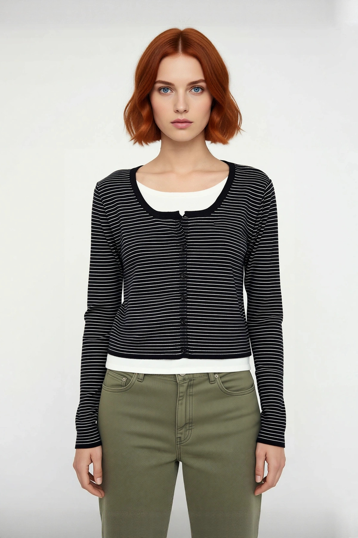 Kadın İnce Triko Çizgili Bisiklet Yaka Standart Kol Rahat Crop Hırka, casual kullanım için tasarlanmış, stil ve konforu bir araya getiren modern bir parçadır. İnce triko kumaşı, hafifliğiyle ilkbahar ve sonbahar günlerinde vazgeçilmeziniz olacak. %57 viskoz, %27 polyester ve %16 poliamid materyal bileşimi sayesinde cilde dost bir dokunuş sunarken, gün boyu rahatlık sağlar. Siyah üzerine zarif beyaz çizgili deseni, basic siluetine hareket katarken, crop boy kesimi ile genç ve dinamik bir tarz yansıtır.