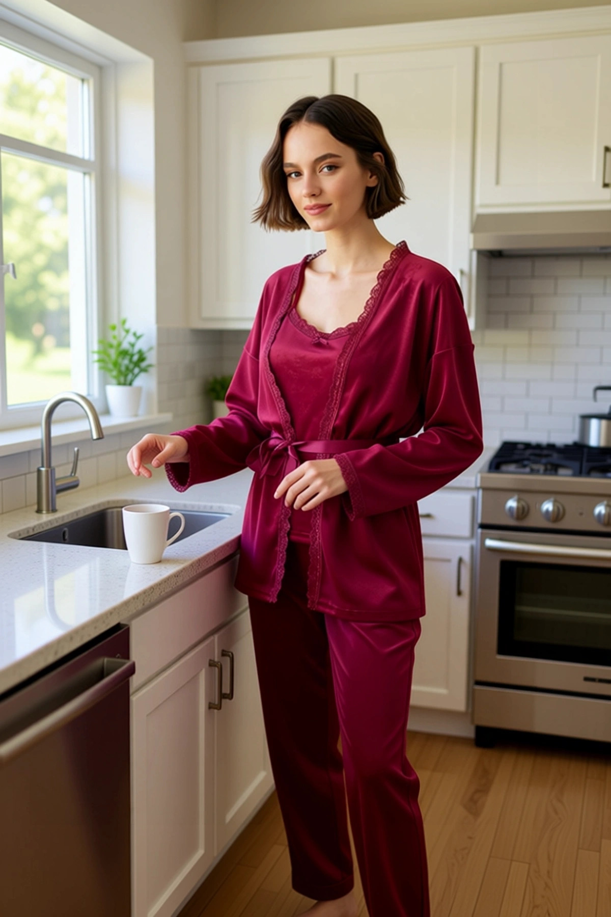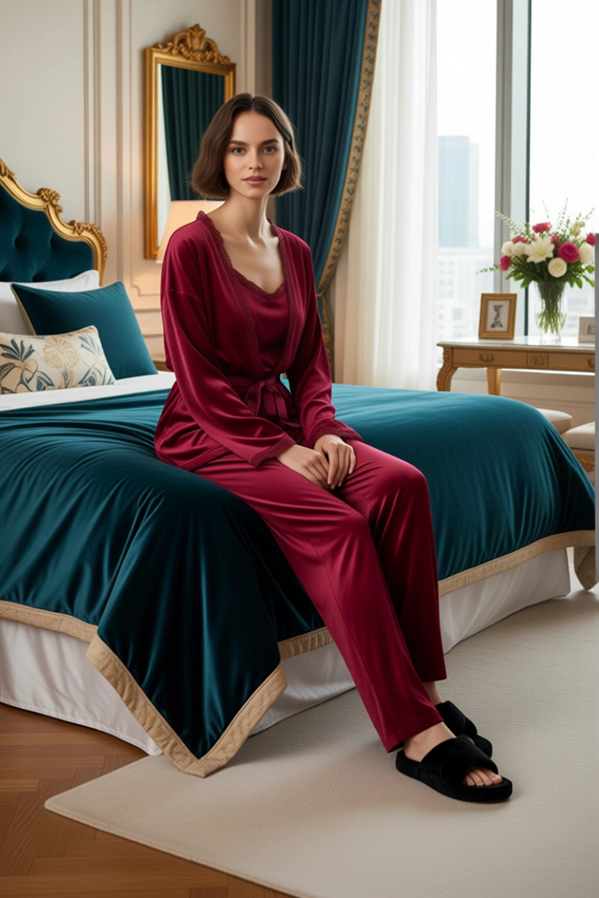 Kadın Kadife Pijama ve Sabahlık Seti Dantel Detaylı Fonksiyonel Dayanıklı Kaliteli Estetik