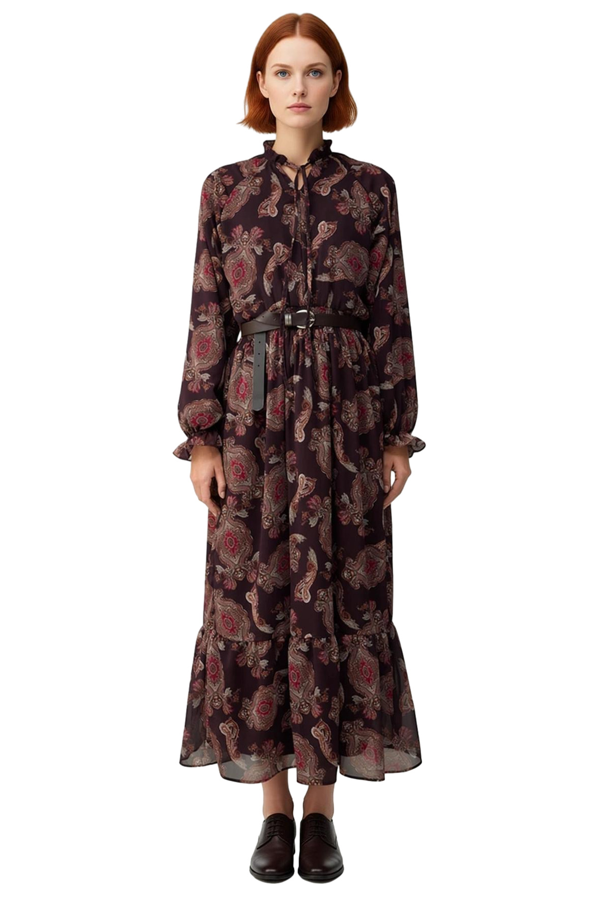 Ürün Özellikleri: A-line kalıp, polyester materyal, şal desen, bisiklet yaka, balon kol, dokuma kumaş, kahverengi renk.