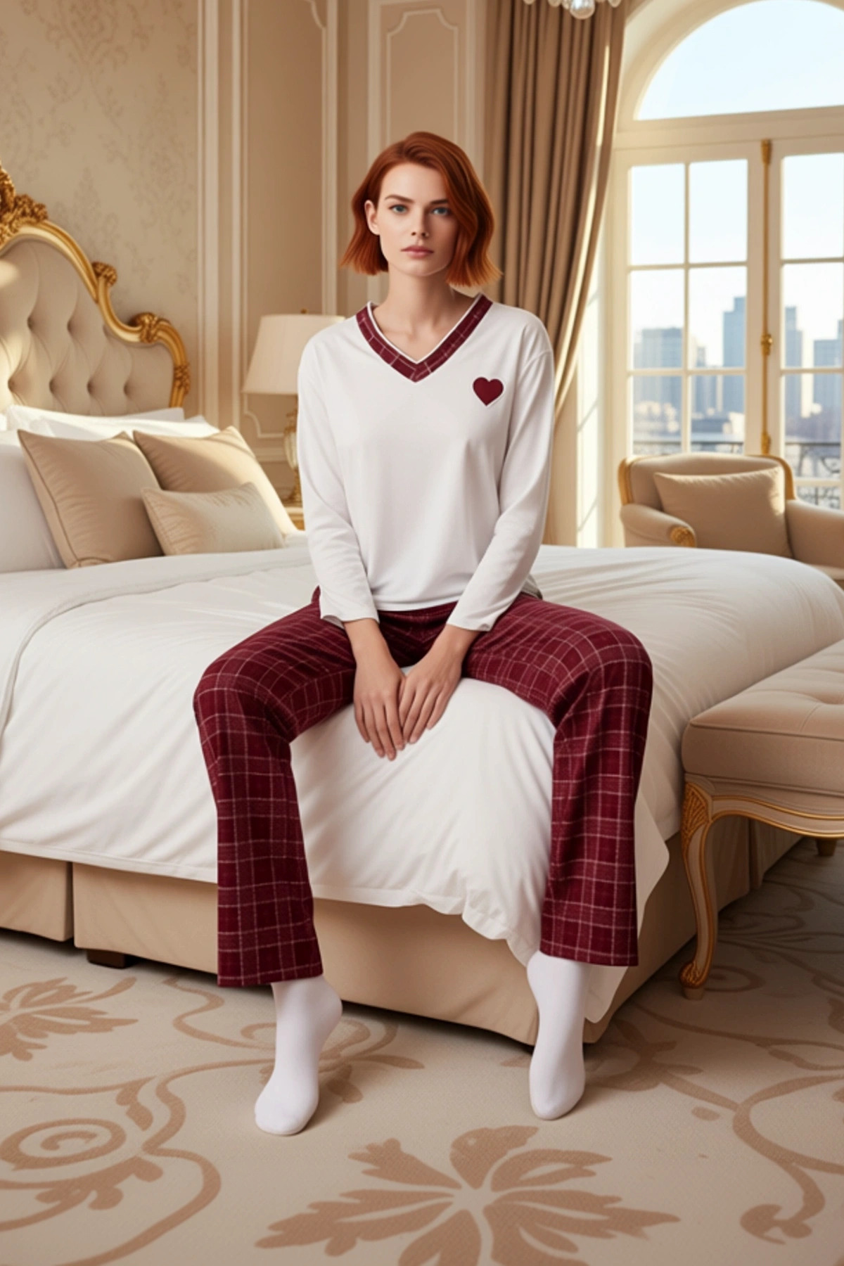 Kadın Kalpli Ekose Detaylı Pijama Takımı Fonksiyonel Dayanıklı Kaliteli Konforlu Estetik Şık