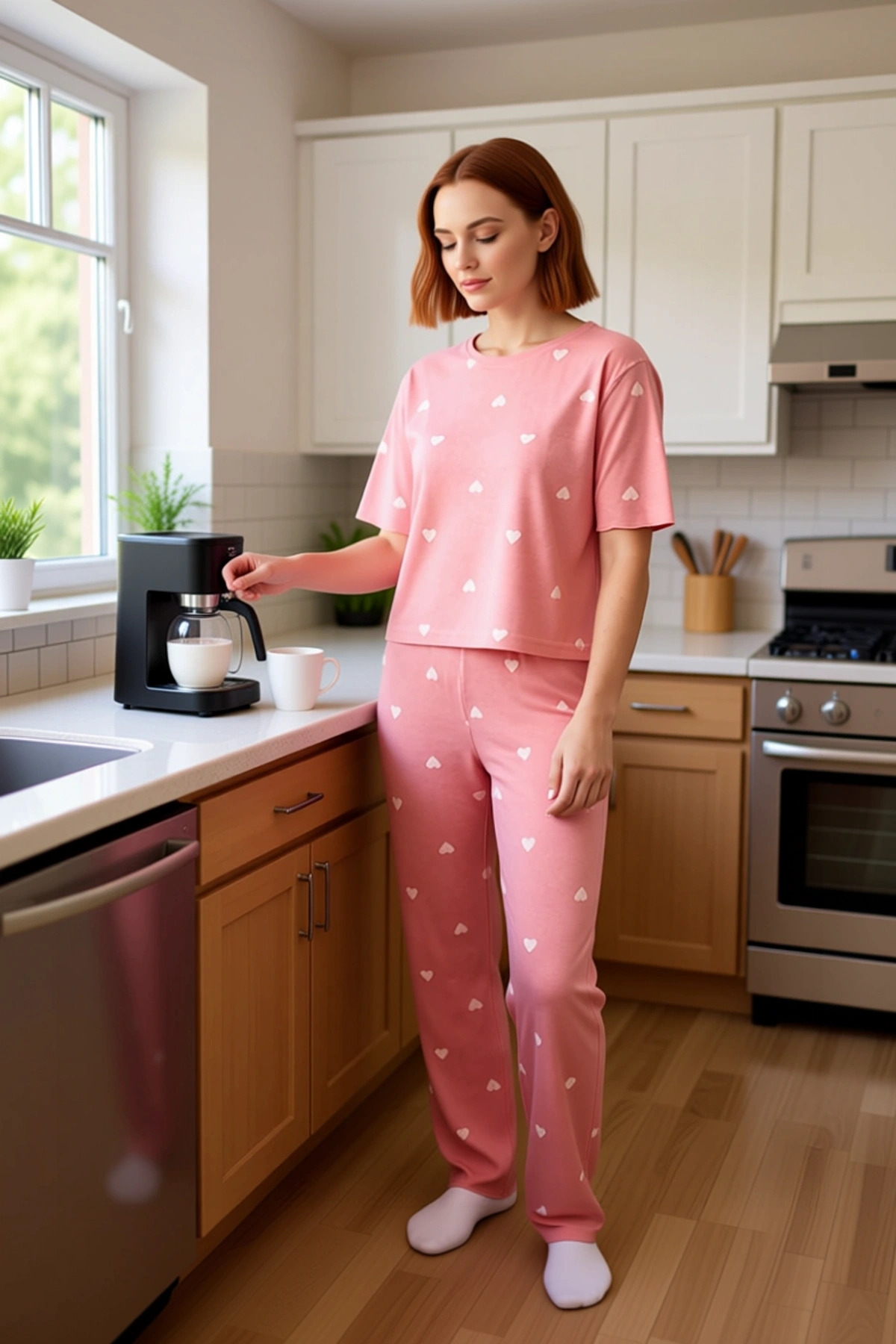 Kadınlar için tasarlanan bu pembe kalp desenli pijama takımı, evde geçirdiğiniz zamanları daha konforlu ve stil sahibi kılmak için üretildi. %95 polyester ve %5 elastan karışımı örme kumaştan yapılmış olan bu takım, yumuşak dokusuyla cildinize nazik davranır. Regular kalıbı, vücut hatlarınıza uyum sağlayarak rahat bir kullanım sunar. Üst kısmında yer alan bisiklet yaka ve kısa kollar, hareket özgürlüğünüzü kısıtlamazken, pantolonun boru paça kesimi ve lastikli beli ekstra konfor sağlar. Üzerindeki sevimli kalp desenleri, takıma neşeli bir hava katarken, metraj baskı tekniğiyle uzun ömürlü bir görünüm elde edilir. Bu takım, lounge ve ev ortamı için idealdir ve cool & comfort persona’sına hitap eder. Bu pijama takımının üstünde bisiklet yaka ve kısa kollu bir tişört bulunurken, alt kısmında ise rahat bir boru paça pantolon yer alır. Pantolonun normal bel ve lastikli detayları, her bedene uyum sağlayarak maksimum konfor sunar. %95 polyester ve %5 elastan içeren örme kumaş, hem esnek hem de nefes alabilen bir yapıya sahiptir, bu da gün boyu rahatlık sağlar. Kaşkorse dokuma tipi, kumaşa ekstra bir yumuşaklık ve doku kazandırır. Bu iki parçalı takım, evde dinlenirken veya günlük ev işleriyle uğraşırken tercih edilebilecek şık ve pratik bir seçenektir. İlkbahar ve sonbahar mevsimlerinde rahatlıkla kullanabileceğiniz bu pijama takımı, evde şıklığınızdan ödün vermek istemeyenler için idealdir. Bu takımı, yumuşak ev terlikleri, pelüş bir sabahlık veya rahat bir kapüşonlu sweatshirt ile tamamlayabilirsiniz. Günlük kullanım için jean pantolon ve spor ayakkabılarla da kombinleyerek casual bir görünüm elde edebilirsiniz. Takımın bakımı için elde yıkama veya düşük ısıda makinede yıkama önerilir. Bu pembe kalp desenli pijama takımı, hem kendiniz için hem de sevdikleriniz için düşünceli bir hediye seçeneği olabilir.