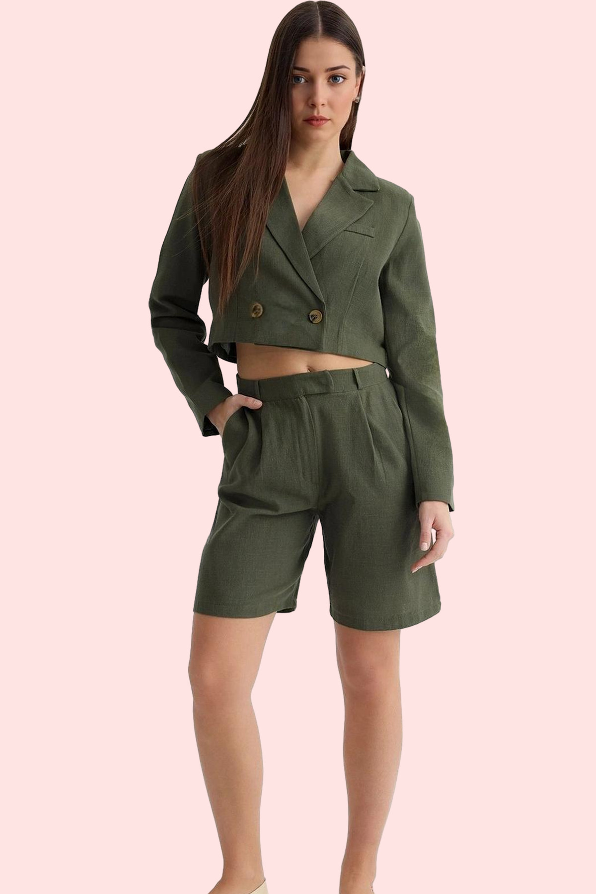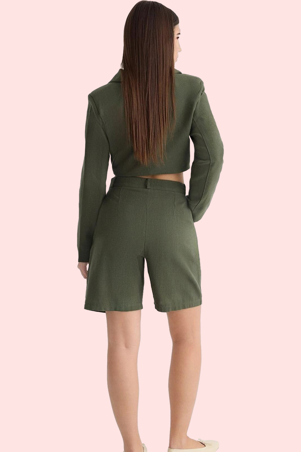 %100 pamuk kumaşın yumuşak dokusu ve nefes alabilirliği, gün boyu konfor sağlar. Keten görünümlü dokuma yapısı ise şık ve modern bir hava katar. Yüksek bel tasarımı, belinizi ince gösterirken straight siluet vücut tipinize mükemmel uyum sağlar. Kapri boy şort, hem şık hem de rahattır, size hareket özgürlüğü tanır.