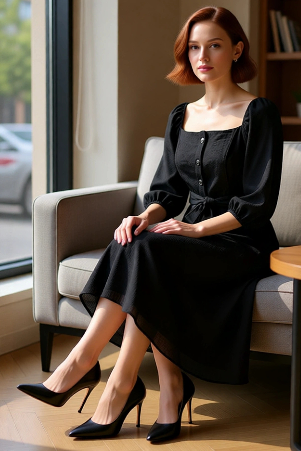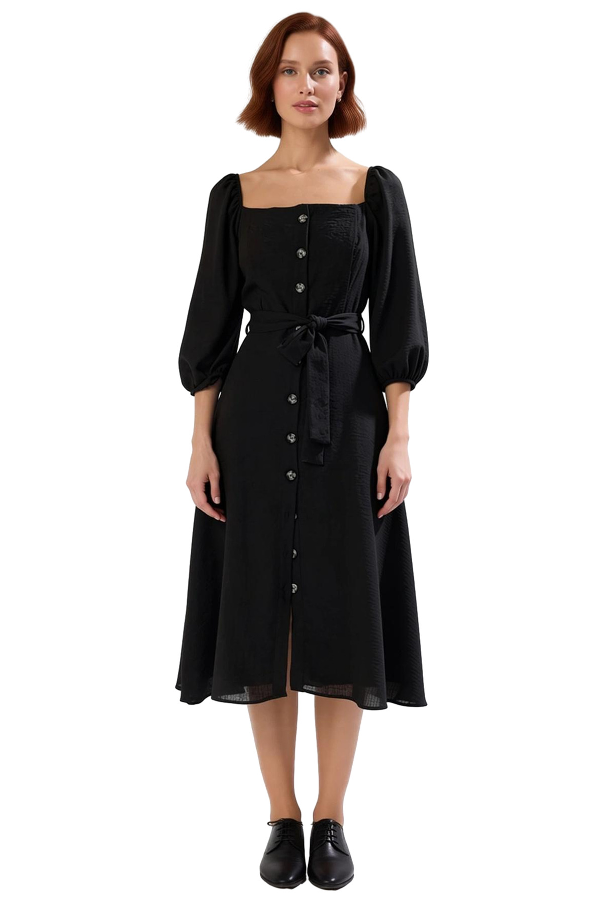 Ürün Özellikleri: Gömlek elbise kalıp, polyester materyal, düz desen, kare yaka, truvakar balon kol, dokuma kumaş, siyah renk, kuşaklı tasarım.