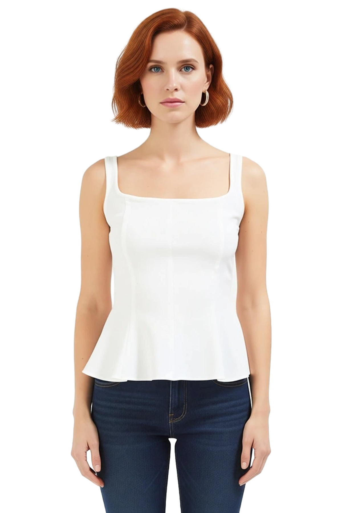 Bu yazın en şık ve rahat bluzunu keşfedin! Finike dokuma kumaştan üretilen beyaz kolsuz bluzumuz, %88 polyester ve %12 elastan karışımıyla hem şık hem de konforlu bir deneyim sunuyor. Zarif kare yakası ve peplum detayıyla modern ve feminen bir tarz oluştururken, regular kalıbı her vücut tipine mükemmel bir uyum sağlıyor. Nefes alan yapısıyla sıcak yaz günlerinde bile serin kalmanıza yardımcı olur. Günlük kullanım için ideal olan bu bluz, şort, etek ve pantolonlarla mükemmel bir uyum yakalar.