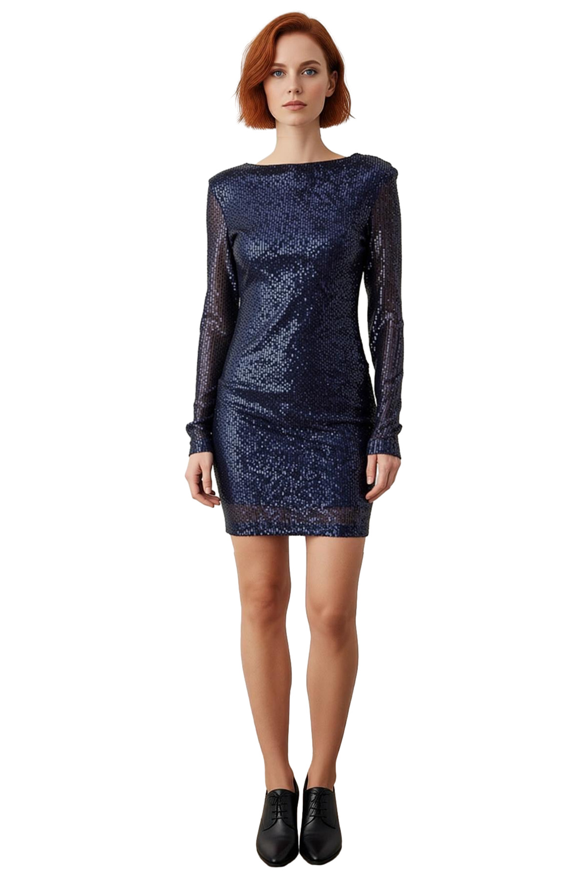 Kadın Kayık Yaka Lacivert Payetli Bodycon Siluet Mini Gece Elbisesi Uzun Kollu Mezuniyet Balo - Görsel 4