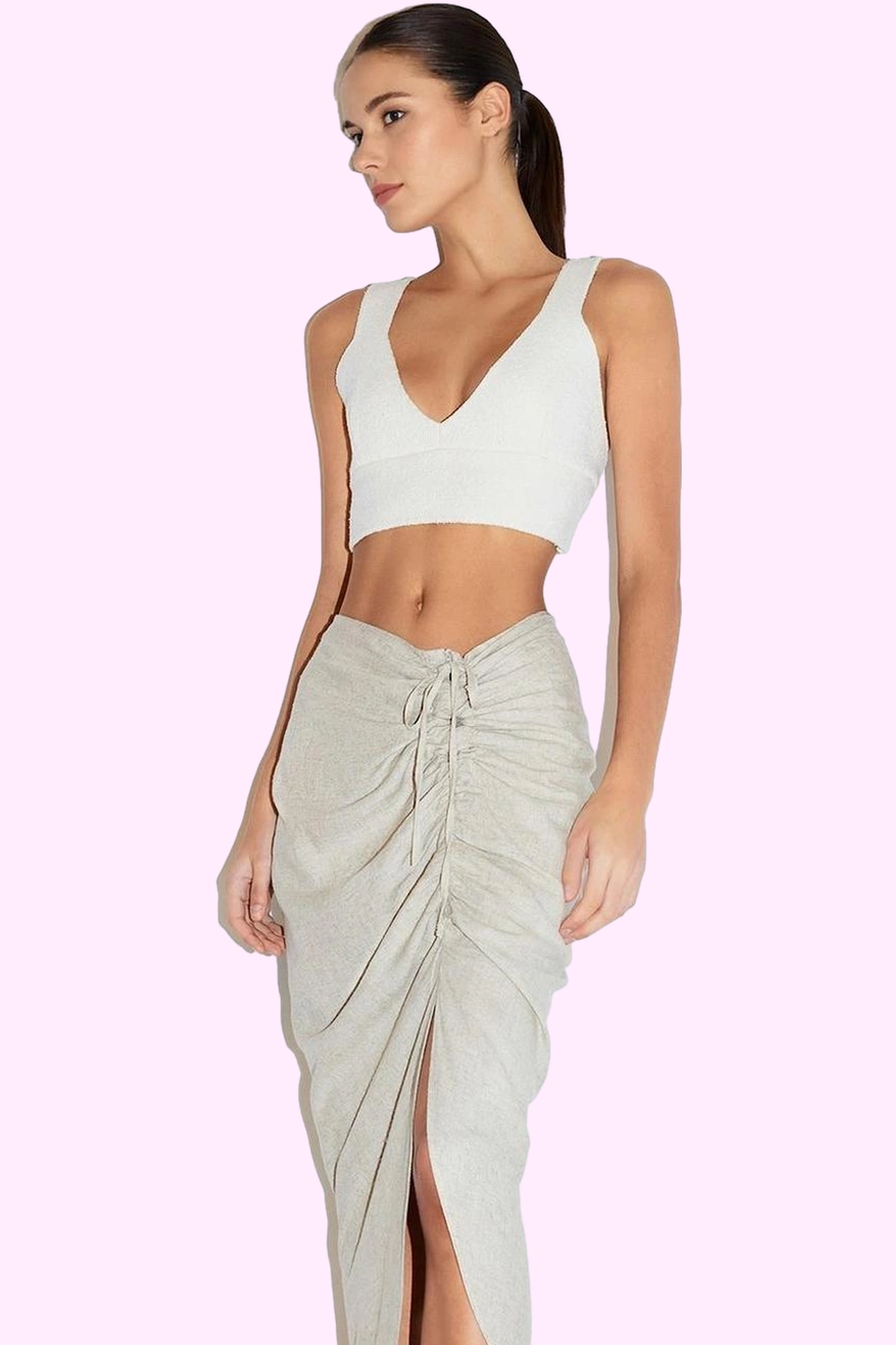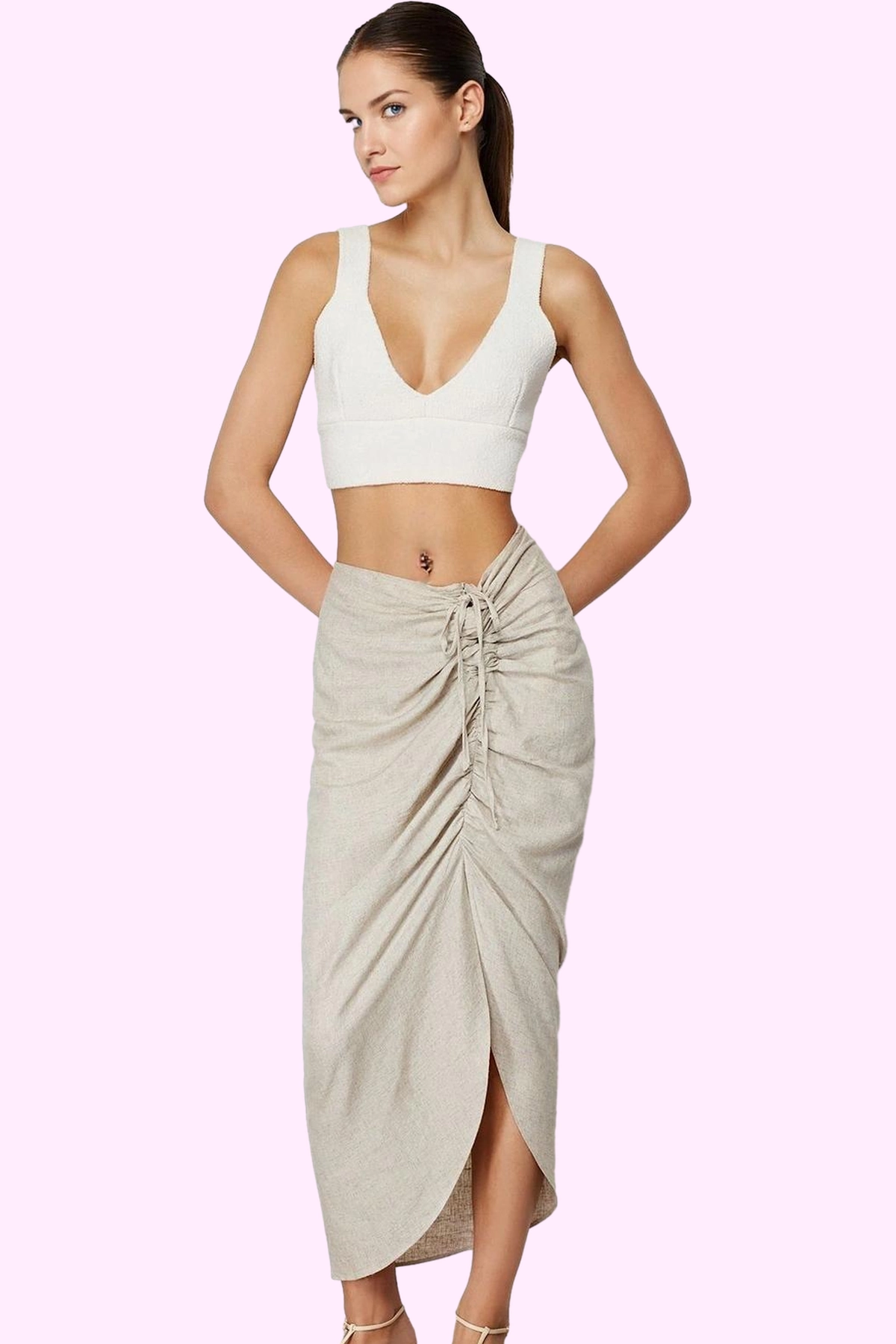 Bu zarif ve rahat bej midi etek, yaz aylarının sıcak günlerinde şıklığı ve konforu bir arada sunuyor. Keten karışımlı dokusu sayesinde nefes alabilir ve hafif bir kullanım deneyimi yaşatırken, asimetrik kesimi ve büzgü detaylarıyla modern ve feminen bir görünüm yaratıyor. Günlük kombinlerinizin vazgeçilmezi olacak bu etek, farklı üstlerle kolayca kombinlenebilir. Bir tişört ve spor ayakkabıyla rahat bir sokak stili elde edebilir, ya da şık bir bluz ve topuklu ayakkabıyla daha sofistike bir görünüm yaratabilirsiniz.