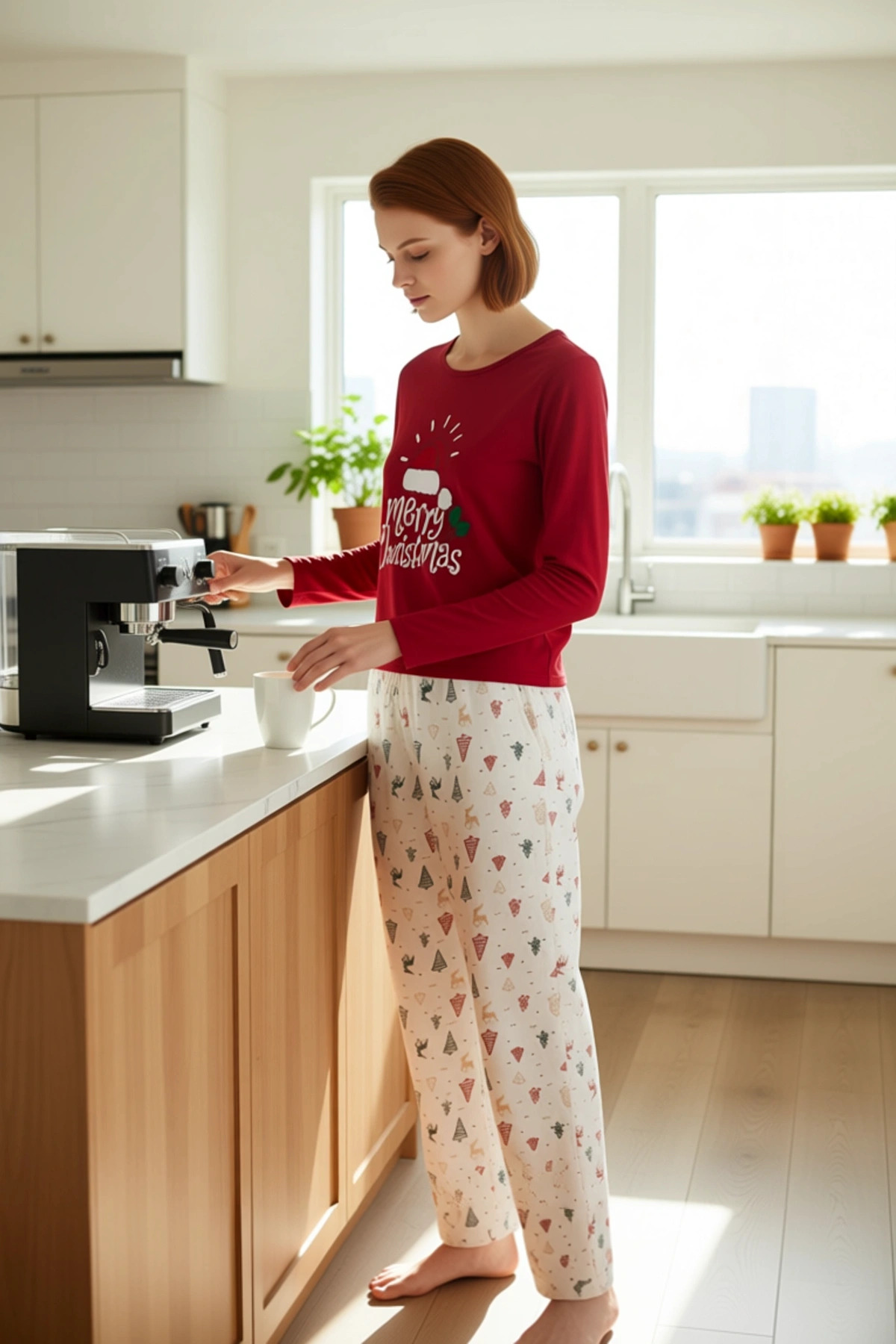 Kadin Kirmizi Yılbaşı Desenli Pamuk Polyester Pijama Fonksiyonel Dayanıklı Kaliteli Modern