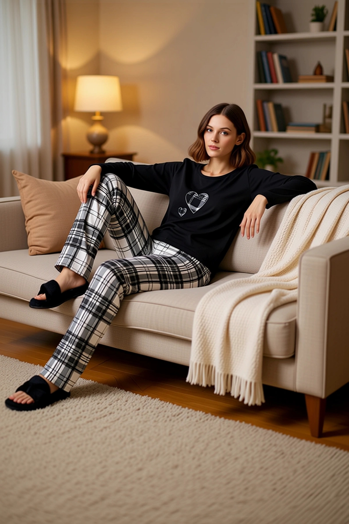 Tarz Rahat Uzun Kollu Boru Paça Kalp Desenli Bağlama Detaylı Viskon Dokuma Pijama Takımı