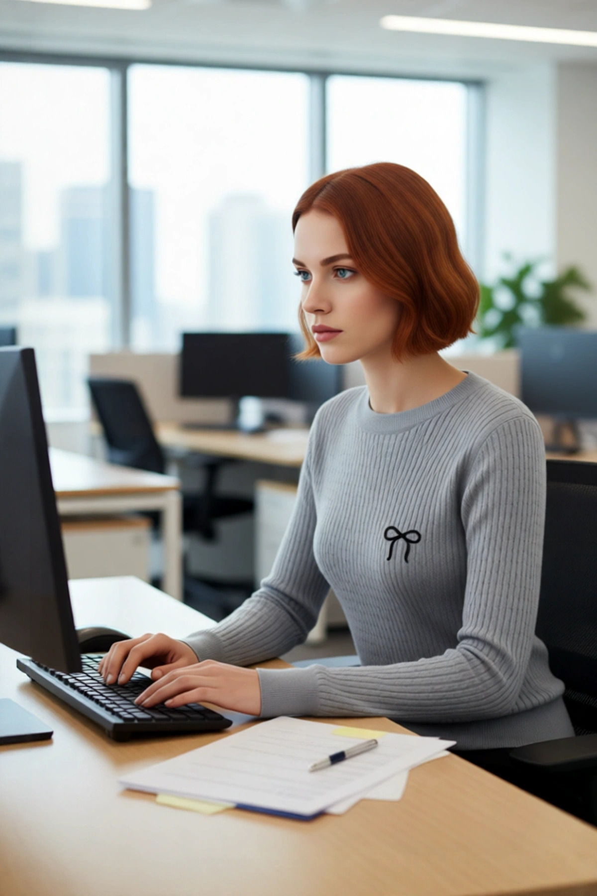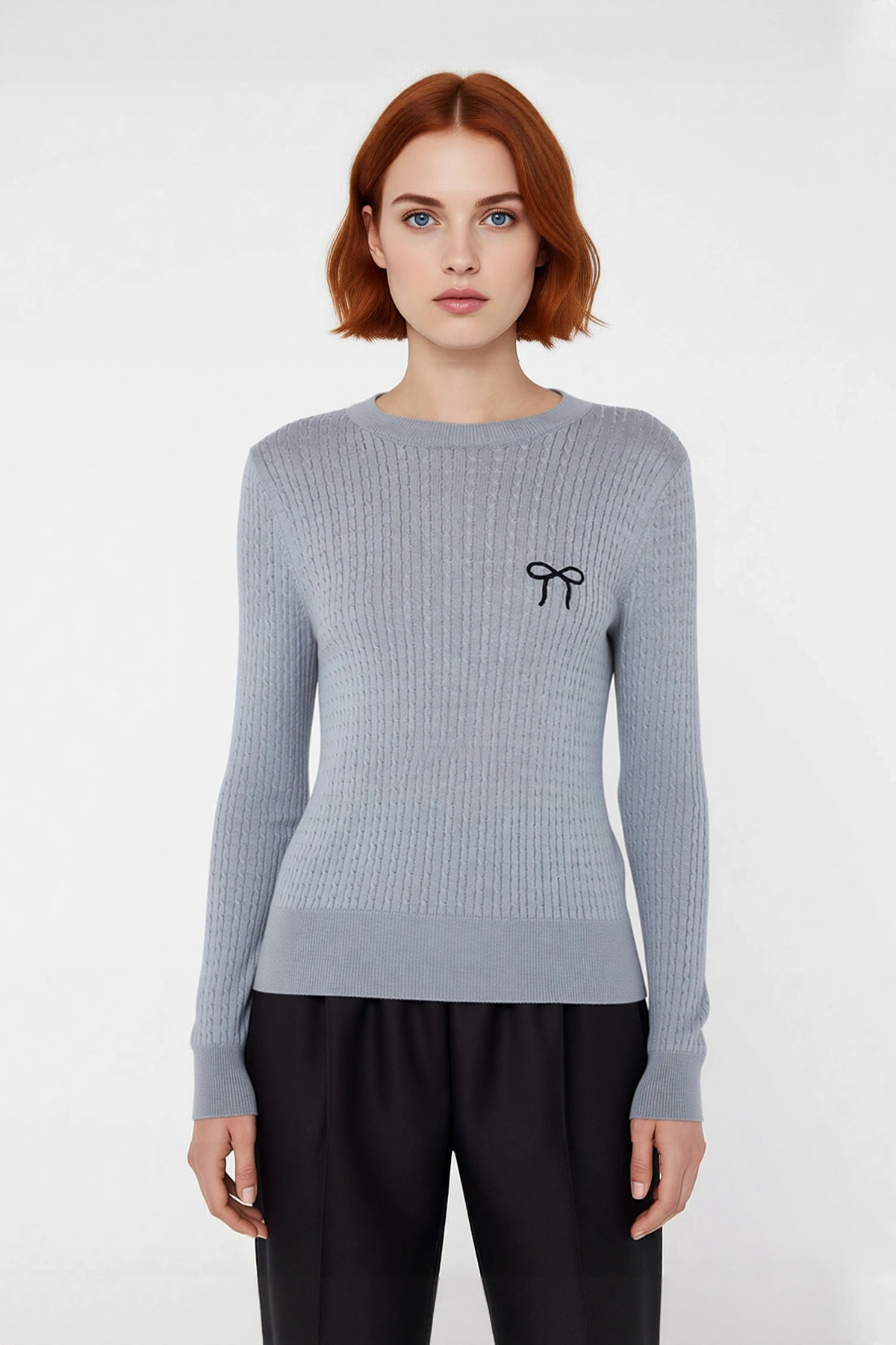 Ürün Özellikleri: Regular kalıp, %50 viskoz %50 akrilik materyal, saç örgü desenli, bisiklet yaka, standart kol, triko kumaş, gri renk, fiyonk nakış detaylı.