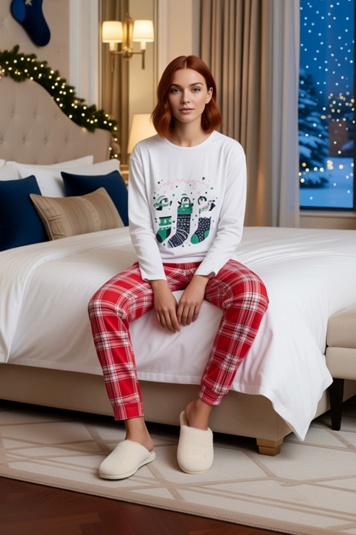 Bu kadın pijama takımı, kışın en sevilen temalarından ilham alınarak tasarlanmıştır. Üst parçada yer alan, yılbaşı çorapları içindeki sevimli penguen baskısı, kış mevsiminin neşesini evinize taşır. Beyaz rengi, baskının canlılığını ön plana çıkarırken, çok renkli detaylar tasarıma hareketlilik katar. %100 pamuk materyali, cildinize yumuşak bir dokunuş sunar ve gün boyu maksimum konfor sağlar. Regular kalıbı, her bedene uyum sağlayarak rahat bir kullanım sunar. Süprem dokuma tipi, kumaşın dayanıklılığını ve yumuşaklığını artırır. Bu pijama takımı, ev giyimi koleksiyonunuzda hem şık hem de rahat bir seçenek olacaktır. Ürün, evde geçirilen zamanı daha keyifli hale getirmek için özel olarak tasarlanmıştır. Bisiklet yaka ve uzun kollu üst, soğuk havalarda sıcaklık sağlarken, standart kol kesimi hareket özgürlüğünüzü kısıtlamaz. Jogger kesimli alt pantolon, boru paça detayıyla modern bir görünüm sunar. Normal bel özelliği, pantolonun rahat bir şekilde oturmasını sağlar. Mix baskı tekniği, üzerindeki desenlerin canlılığını ve kalıcılığını garanti eder. Bu pijama takımı, hem evde dinlenirken hem de sevdiklerinizle keyifli vakit geçirirken size eşlik edecek. Cool & Comfort persona’sına uygun olarak tasarlanmış bu ürün, lounge ve ev ortamları için idealdir. %100 pamuk içeriği, cildinize dost bir his verir ve alerjik reaksiyon riskini minimize eder. Kış mevsiminin vazgeçilmez parçalarından biri olan bu pijama takımı, evdeki rahat anlarınızı taçlandırır. Üst kısmındaki sevimli penguen baskısı, kış temasına uygun bir neşe katarken, alt kısmındaki ekose desenli pantolon ile uyumlu bir bütünlük oluşturur. Bu takımı, yumuşak bir ev terliği ve rahat bir hırka ile kombinleyerek kışın en soğuk günlerinde bile sıcacık kalabilirsiniz. Düz kesim tişört ve boru paça jogger pantolon, hem ayrı ayrı hem de takım olarak kullanılabilme özelliği sunar. Bu pijama takımı, yumuşak dokusu ve nefes alabilen yapısı sayesinde uzun süreli kullanıma uygundur. Üretim yeri Türkiye’dir ve örme kumaş yapısı dayanıklılığını destekler.