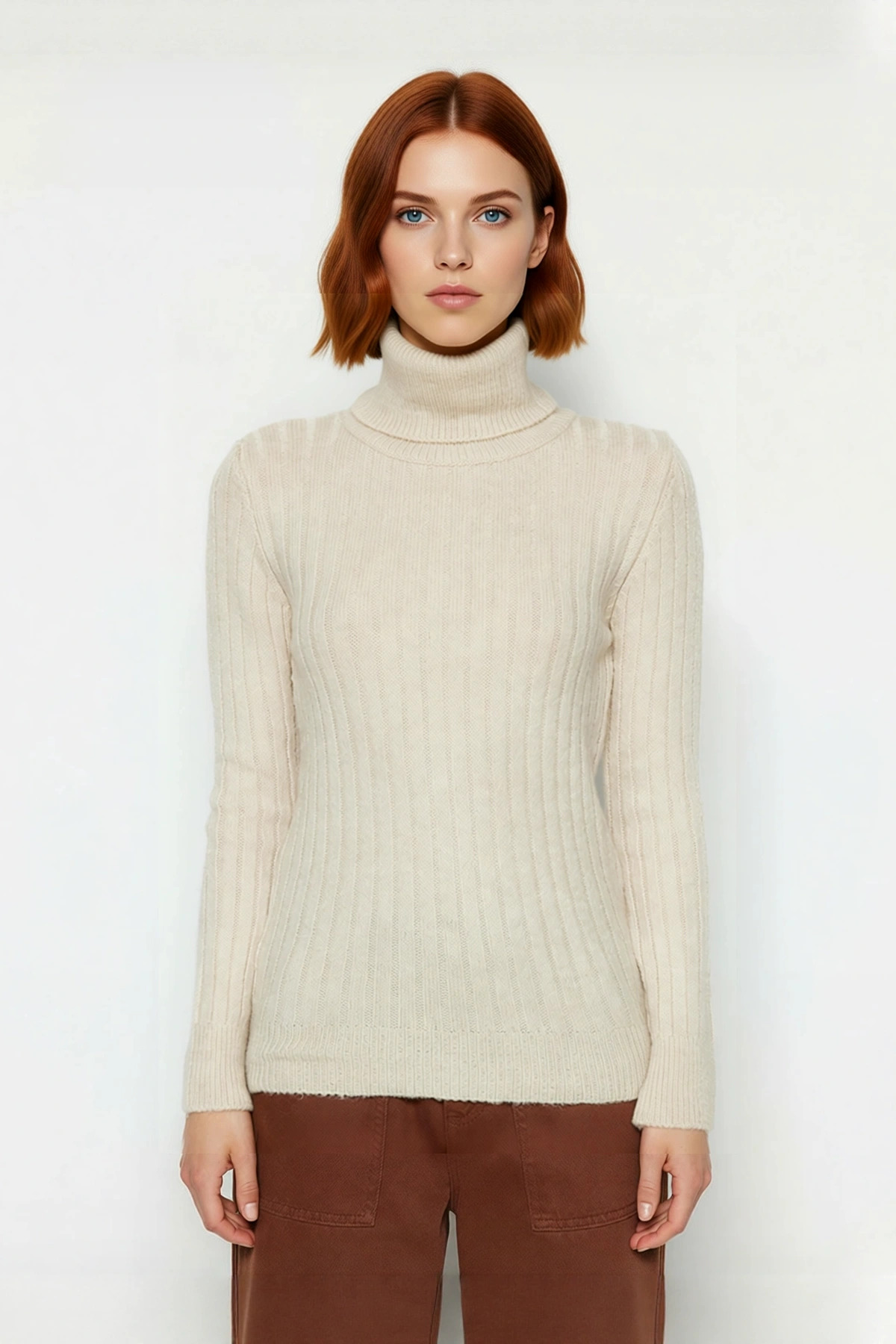 Ürün Özellikleri: Fitted kalıp, akrilik materyal, fitilli desen, balıkçı yaka, standart kol, triko kumaş, bej renk, cepsiz tasarım, orta kalınlık.