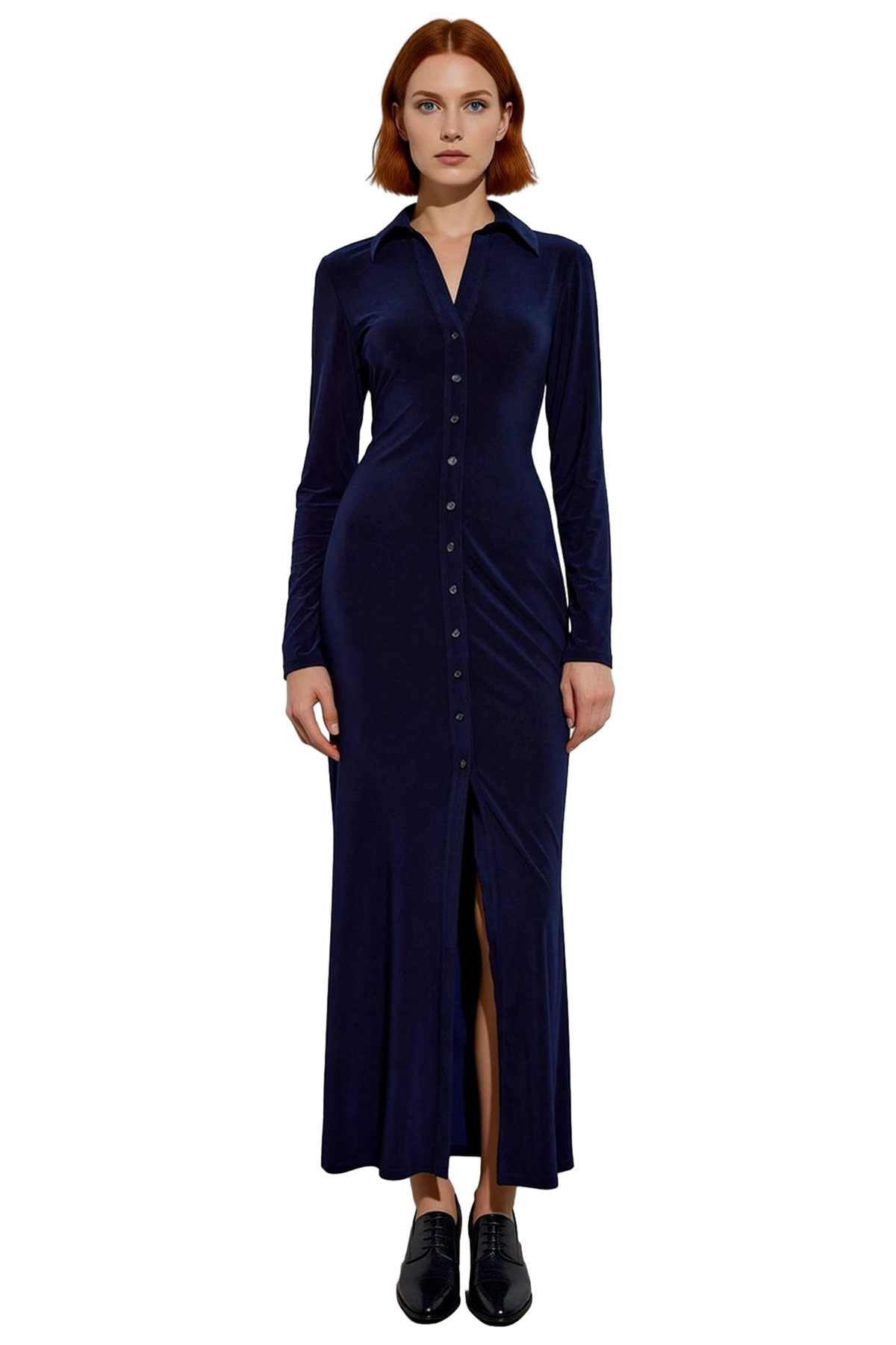 Ürün Özellikleri: Bodycon kalıp, 96% polyester 4% elastan materyal, düz desen, polo yaka, standart kol, örme kumaş, lacivert renk.