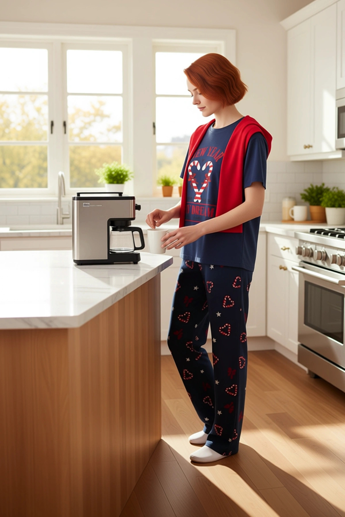 Kadınlara özel bu lacivert pijama takımı, kış aylarında evinizde konfor ve şıklığı bir arada sunuyor. Üst kısımda yer alan bisiklet yaka tişört, uzun kollu tasarımıyla soğuk günlerde sıcaklık sağlarken, düşük kol detayı modern bir dokunuş katıyor. Alt kısımda ise rahat bir kullanım sunan boru paça ve normal bel detaylı bir pantolon bulunuyor. Takımın tamamı, canlı yılbaşı temalı kalp ve yıldız desenleriyle bezenmiş, bu da ona neşeli bir hava katıyor. %52 polyester ve %48 pamuk karışımından oluşan örme kumaşı, yumuşaklığı ve nefes alabilirliği ile öne çıkıyor. Regular kalıbı, her bedene uyum sağlayarak gün boyu rahatlık sunuyor. Bu pijama takımı, evde geçirilen zamanları daha keyifli hale getirmek için özel olarak tasarlandı. Bu pijama takımının bisiklet yaka tişörtü, rahatlığı ön planda tutarak tasarlanmıştır. Düşük kol detayı, hareket serbestliği sağlarken, uzun kolları soğuk havalarda ekstra sıcaklık sunar. Pantolonun boru paça kesimi, rahat bir uyum sağlarken, normal bel detayı gün boyu konforu garanti eder. Süprem dokuma tipi, kumaşın kalitesini ve dokusunu vurgular. Bu takım, cool ve comfort persona ile mükemmel bir uyum içindedir ve lounge/home ortamlarında kullanım için idealdir. Evde dinlenirken veya keyifli vakit geçirirken kendinizi hem rahat hem de şık hissetmenizi sağlayacak şekilde üretilmiştir. Kış mevsiminin soğuk günlerinde sizi sıcacık tutacak bu pijama takımı, ev gardırobunuzun vazgeçilmez bir parçası olacak. Kombin önerisi olarak, bu takımı yumuşak ev terlikleri ve pelüş bir sabahlıkla tamamlayarak tam bir ev konforu yaratabilirsiniz. Üzerine alacağınız salaş bir hırka ile de dışarı çıkmadan da şık görünebilirsiniz. Bu pijama takımı, kolay bakımı sayesinde uzun ömürlüdür; düşük sıcaklıkta makinede yıkanması tavsiye edilir.