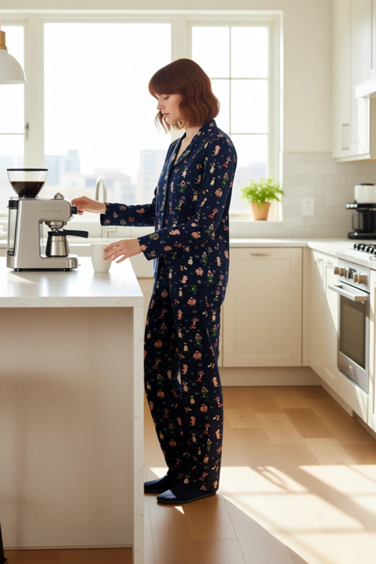 Bu şık ve rahat kadın pijama takımı, kış gecelerinizi daha keyifli hale getirmek için tasarlandı. %100 pamuk içeriği, cildinize nefes aldıran bir konfor sunarken, lacivert zemin üzerine işlenmiş eğlenceli penguen desenleri evinize neşe katacak. Metraj baskı tekniğiyle uygulanan desenler, canlılığını uzun süre koruyarak takımın estetik değerini artırır. Örme kumaş yapısı, esnekliği ve yumuşaklığı sayesinde hareketlerinizi kısıtlamadan maksimum konfor sağlar. Fitted kalıbı, vücudunuza nazikçe uyum sağlayarak hem şık bir görünüm sunar hem de uyku sırasında rahatlık sağlar. Bu iki parçalı takım, gömlek ve pantolondan oluşur, ev giyiminde pratik bir çözüm sunar. Cool ve konforlu bir stil arayan kadınlar için idealdir. Evde veya dinlenme anlarında rahatlıkla kullanabileceğiniz bu takım, kış koleksiyonunun vazgeçilmez parçalarından biri olacak. Takımın gömlek yakası ve düğmeli ön kısmı, klasik bir pijama tasarımını yansıtırken, uzun kollu yapısı kış aylarında ekstra sıcaklık sağlar. Standart kol kesimi, hareket özgürlüğünü kısıtlamaz. Pantolonun boru paça ve normal bel detayı, gün boyu süren bir rahatlık sunar. 30/1 openend süprem dokuması, kumaşın dayanıklılığını ve yumuşaklığını artırır. Bu pijama takımı, soğuk kış günlerinde sizi sıcacık tutacak ve evdeki zamanınızı daha konforlu hale getirecektir. Yumuşak dokusu ve rahat kalıbı sayesinde kendinizi evinizde daha huzurlu ve güvende hissedeceksiniz. Bu ürün, rahatlığından ödün vermek istemeyen ancak stilinden de vazgeçemeyen kadınlar için özel olarak tasarlanmıştır. Evdeki stilinizi tamamlayacak bu pijama takımı, günlük kullanım için de oldukça uygundur. Bu pijama takımı, kış mevsiminin soğuk günleri için özel olarak üretilmiştir. Evde geçirdiğiniz zamanlarda sizi sıcak tutacak ve konforunuzu en üst düzeyde tutacaktır. Kombin önerisi olarak, yumuşak ev terlikleri veya kalın çoraplarla mükemmel bir uyum yakalayabilirsiniz. Sabahları kahve keyfi yaparken veya akşamları dinlenirken bu takımı tercih edebilirsiniz. Bakımı oldukça kolaydır; benzer renklerle makinede yıkanabilir ve düşük ısıda ütülenebilir. Bu sayede pijama takımınızın kalitesini ve görünümünü uzun süre koruyabilirsiniz. Bu ürün, hem kendiniz için hem de sevdikleriniz için düşünceli bir hediye seçeneği olacaktır.