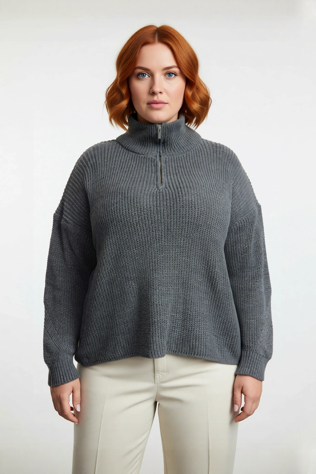 Kadınlar için tasarlanan bu şık ve konforlu Regular Kalıp Fermuarlı Triko Kazak, soğuk kış aylarının vazgeçilmezi olmaya aday. Yüksek kaliteli %100 akrilik materyali ile üretilen bu kazak, soğuklara karşı etkili bir koruma sağlarken cildinize narin bir dokunuş sunar ve gün boyu süren bir sıcaklık hissi verir. Düz deseni sayesinde minimalist ve modern bir estetik sunarken, antrasit gri rengi her gardıropla uyum sağlayarak çok yönlü kullanım imkanı tanır. Casual/günlük ortamlar için biçilmiş kaftan olan bu parça, basic silüeti ve regular boyu ile gün boyu rahatlık ve şıklığı bir arada sunar.
