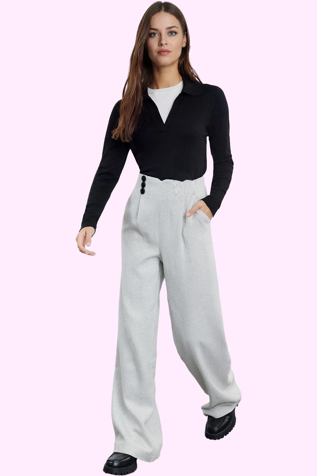 Bu kadın pantolonu, kış ayları için tasarlanmış şık ve fonksiyonel bir parçadır. %66 polyester, %21 pamuk, %8 viskoz ve %5 poliamid karışımından oluşan dokuma kumaşı, hem sıcak tutar hem de dayanıklılık sunar. Geniş paça (wide leg) kesimi, modern bir siluet oluştururken, kırçıllı deseni pantolona sofistike bir görünüm kazandırır. Normal bel yüksekliği ve uzun boyu, rahat bir kullanım sağlarken, kaşe dokuma tipi kışlık giyim için ideal bir seçenektir. Bu pantolon, cool ve comfort persona ile hem günlük hem de daha özel günler için uygun bir alternatiftir. Ramadan koleksiyonuna ait bu ürün, Türkiye’de üretilmiştir ve günlük ortamlarda rahatlıkla tercih edilebilir. Pantolonun tasarımında öne çıkan özellikler, geniş paça kesimi ve zarif düğme detaylarıdır. Bu detaylar, pantolona özgün bir karakter kazandırır. Normal bel kalıbı, gün boyu konforlu bir deneyim sunar ve hareket özgürlüğünü kısıtlamaz. Kırçıllı deseni, pantolona derinlik ve stil katarken, kaşe dokuma kumaşı kışın soğuklarına karşı etkili bir koruma sağlar. Wide leg silueti, modern bir estetik sunarken, uzun boyu zarif bir duruş sergilemenize yardımcı olur. Bu pantolon, hem şıklığı hem de rahatlığı bir arada arayan kadınlar için tasarlanmıştır ve gardıropların temel taşlarından biri olmaya adaydır. Kış mevsimine uygun olarak tasarlanan bu pantolon, şık bir bluz veya triko ile kolayca kombinlenebilir. Dar kesim bir kazak ve topuklu botlarla zarif bir ofis stili oluşturabilirsiniz. Daha rahat bir görünüm için ise oversize bir sweatshirt ve spor ayakkabılarla sokak modasına uygun bir kombin yapabilirsiniz. Pantolonun bakımında kuru temizleme tercih edilmelidir. Bu yöntem, kumaşın dokusunu koruyarak pantolonun ömrünü uzatır.