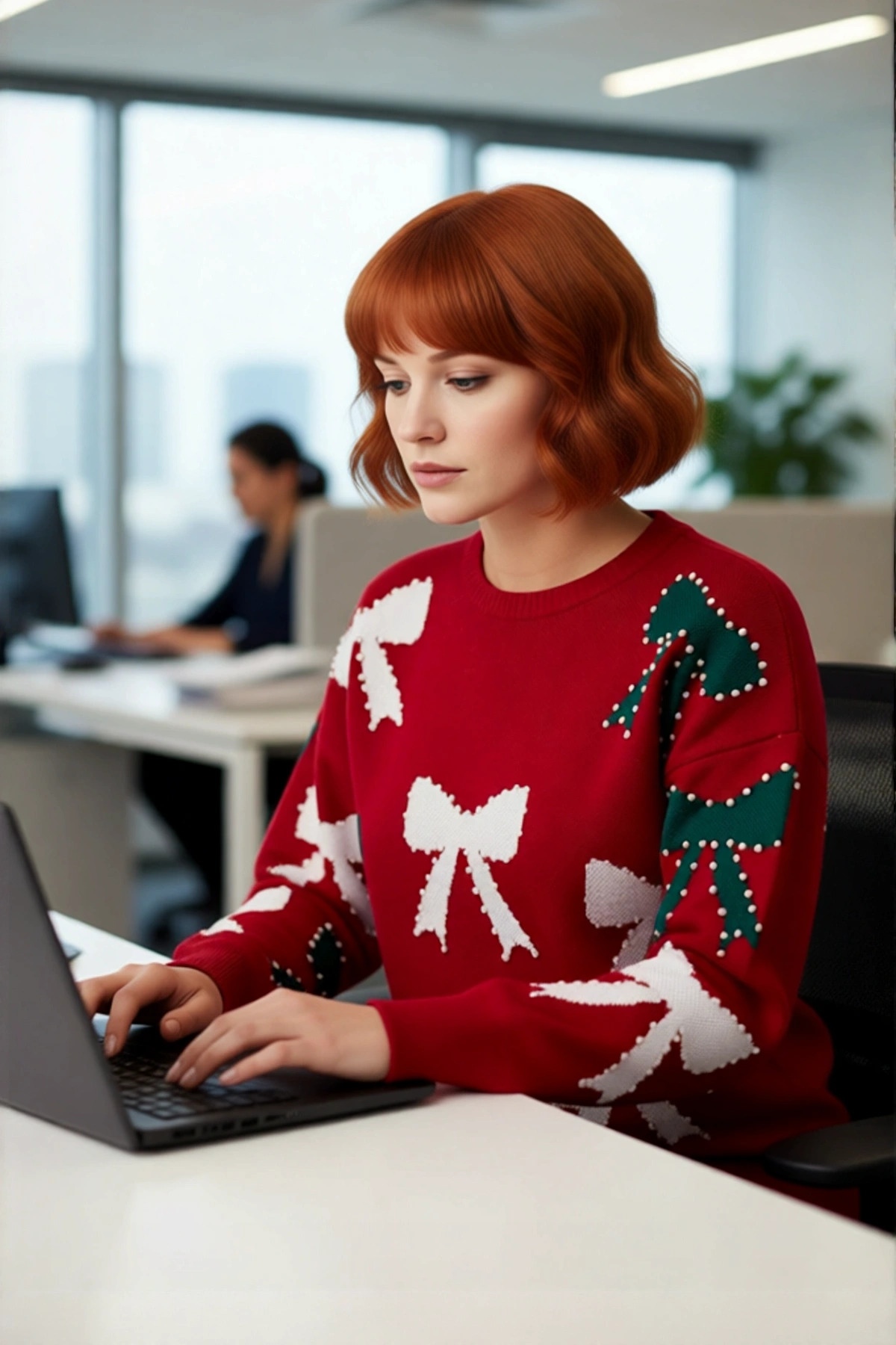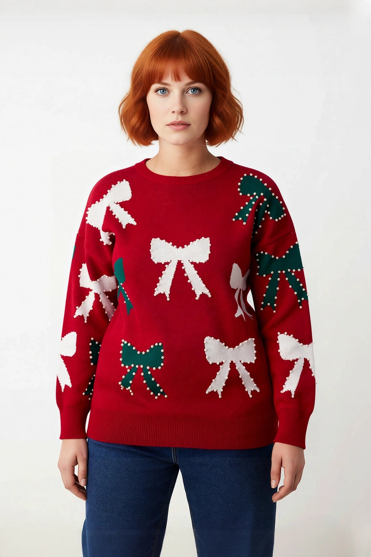 Kadın Kışlık Yılbaşı Temalı Fiyonklu İncili Bisiklet Yaka Uzun Kol Düşük Omuz Regular Triko Kazak