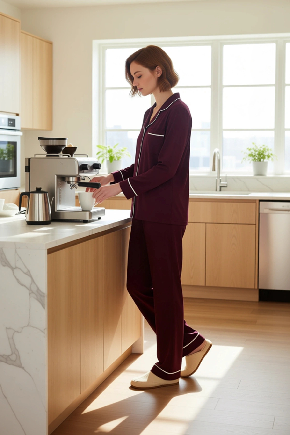 Bu kadın pijama takımı, klasik ve zarif tasarımıyla ev giyiminde fark yaratır. Düz bordo rengi, her zaman popülerliğini koruyan zamansız bir seçenektir. %50 pamuk ve %50 polyester karışımı örme kumaştan üretilen bu takım, yumuşak dokusu ve dayanıklılığı ile öne çıkar. Süprem dokuma tekniği, kumaşa ekstra bir yumuşaklık katarken, regular kalıbı sayesinde rahat bir kullanım sunar. Gömlek yaka ve uzun standart kol detayı, klasik bir pijama görünümü sağlarken, boru paça pantolon modern bir dokunuş ekler. Üzerindeki cep detayı, fonksiyonelliği artırır ve bu takımı hem rahat hem de şık bir seçenek haline getirir. Evdeki anlarınızı daha keyifli hale getirmek için tasarlanmıştır. Takımın temel özellikleri arasında gömlek yaka, uzun standart kollar ve boru paça pantolon bulunur. Regular kalıp, vücuda tam oturarak hareket özgürlüğü sağlarken, biye detayları ürüne sofistike bir hava katar. %50 pamuk ve %50 polyester karışımı kumaş, hem cildin nefes almasına olanak tanır hem de uzun süreli kullanımlarda formunu korur. Bu pijama takımı, evde geçirdiğiniz zamanı konforlu kılmak için özenle seçilmiş materyallerle üretilmiştir. Gömlek yaka detayı, klasik bir stil sunarken, biye detayları ürüne zarif bir dokunuş ekler. Ürün, hem gündelik kullanım hem de özel anlar için uygun bir seçenektir. Kış mevsiminin vazgeçilmez parçalarından biri olan bu pijama takımı, sıcak tutan yapısıyla sizi sarar. Bu takımı, yumuşak ev terlikleri veya şık bir sabahlıkla kombinleyebilirsiniz. Pantolon kısmını, düz renk bir kazak veya hırka ile de tamamlayarak ev içinde farklı bir stil yaratabilirsiniz. Ürünün uzun ömürlü olması için düşük sıcaklıkta elde veya makinede yıkama önerilir. Bu sayede kumaşın dokusu ve rengi korunur. Bu pijama takımı, kendinize veya sevdiklerinize verebileceğiniz şık ve kullanışlı bir hediyedir.