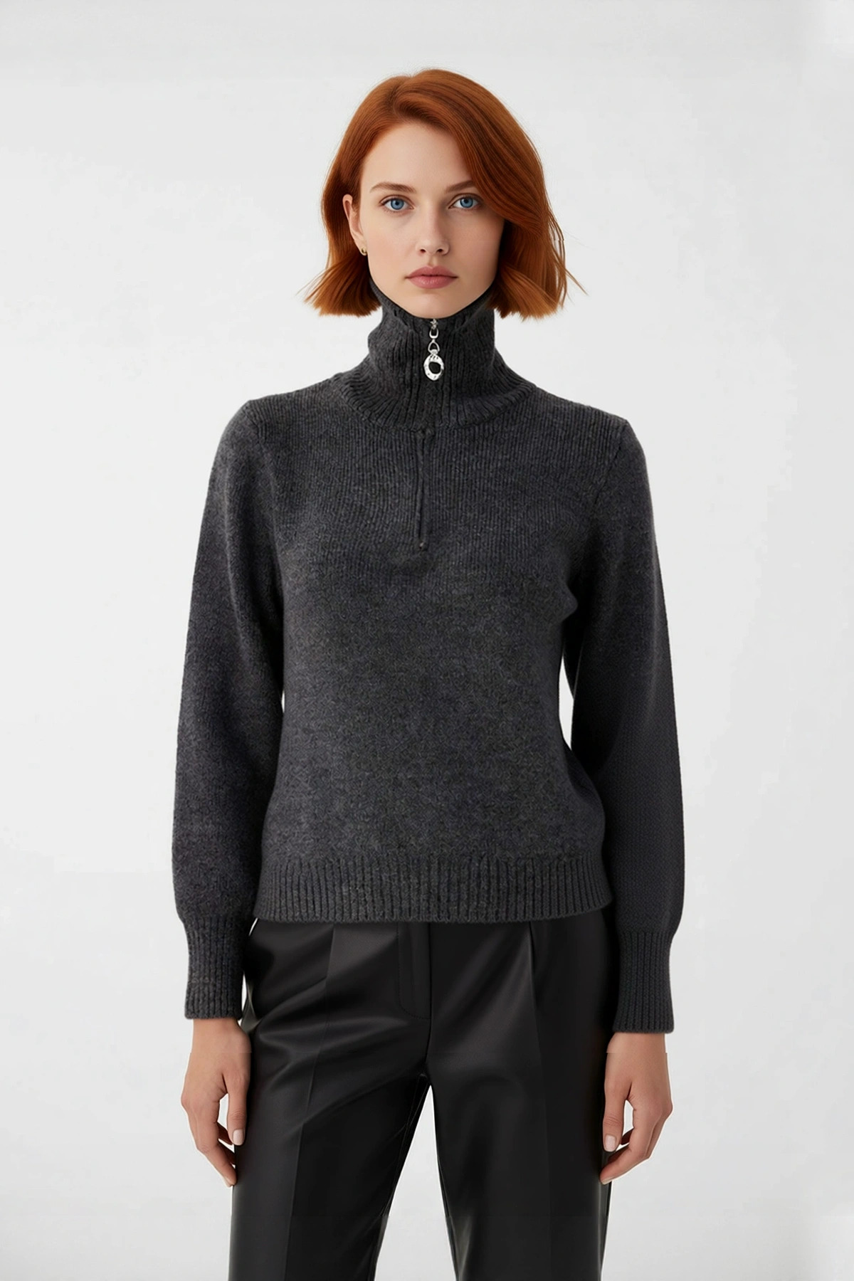 Ürün Özellikleri: Regular kalıp, %58 akrilik %34 polyester %7 yün %1 elastan materyal, düz desen, dik yaka, standart kol, triko kumaş, antrasit renk.