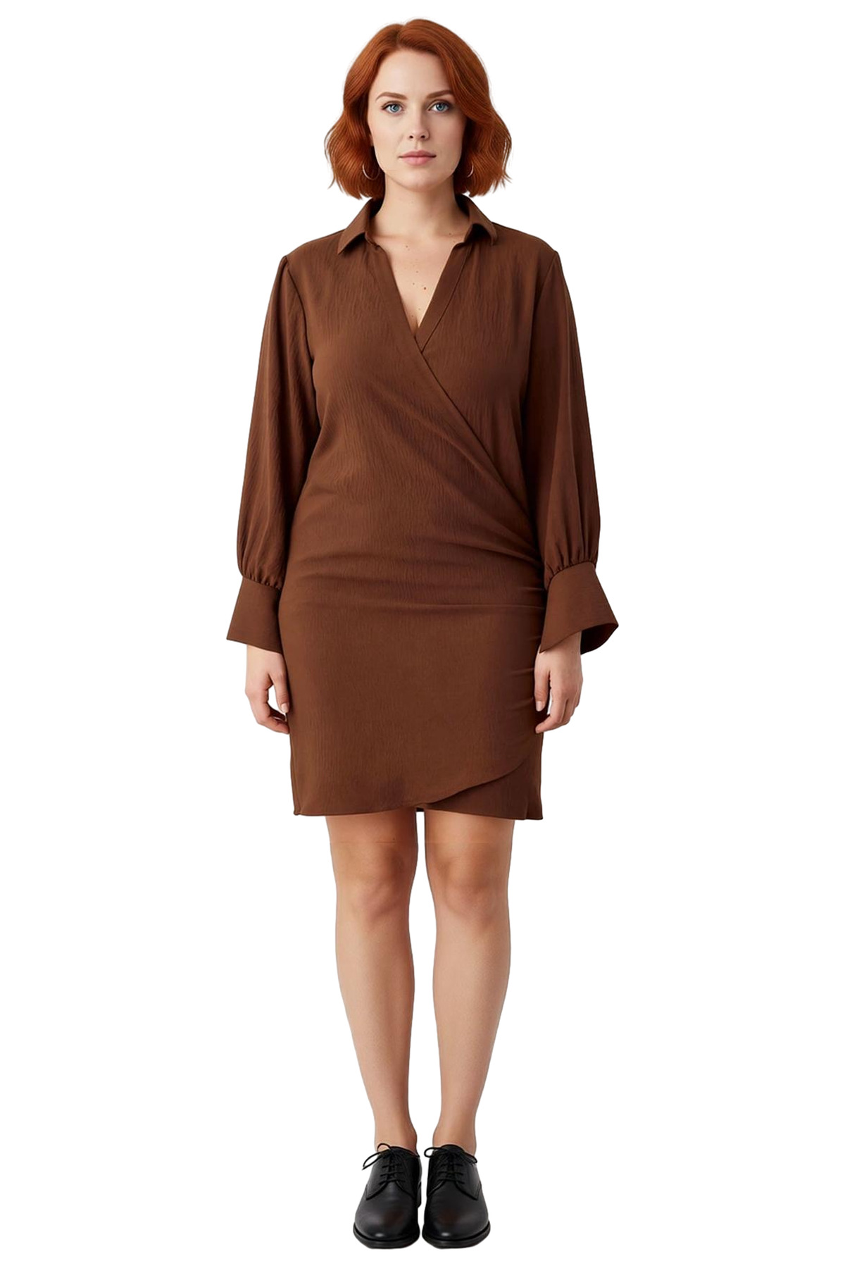 Ürün Özellikleri: Kruvaze kalıp, %100 Polyester materyal, düz desen, V yaka, standart kol, dokuma kumaş, kahverengi renk.
